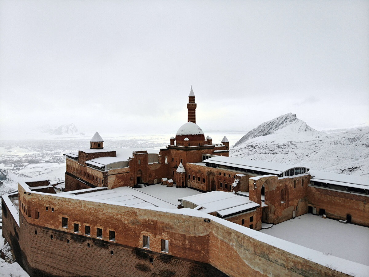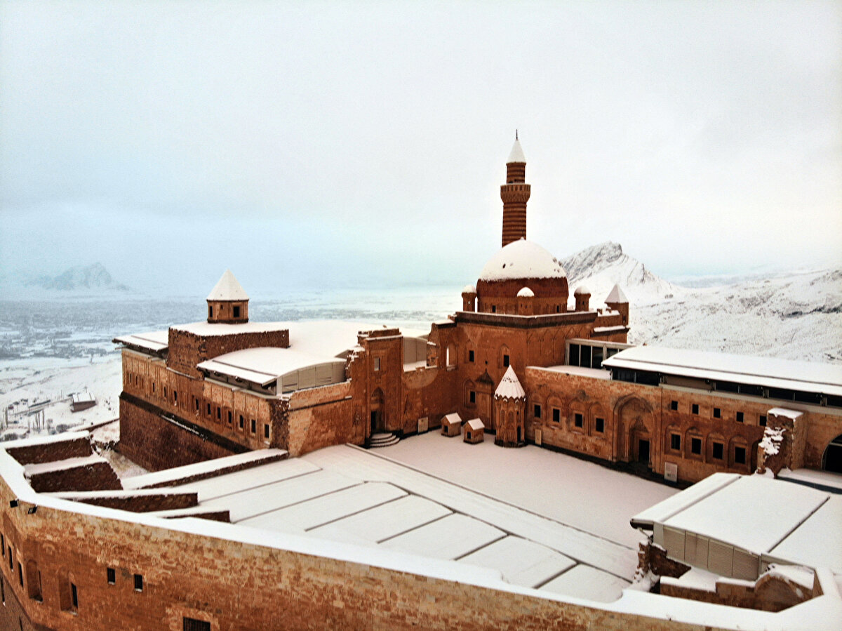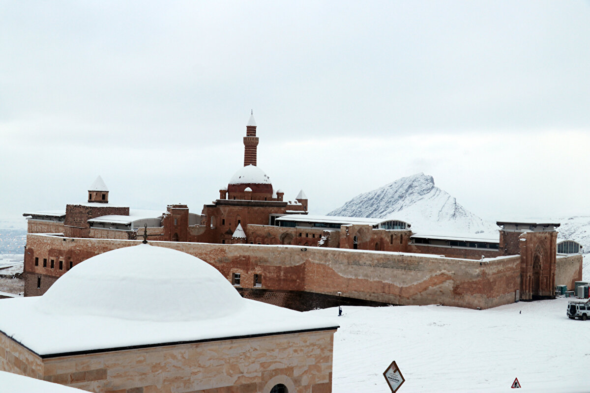 Yılın her mevsimi ayrı bir güzelliğe bürünerek ziyaretçilerini cezbeden İshak Paşa Sarayı, kış mevsiminin gelmesiyle bölgede etkili olan kar yağışı sonrası beyaz örtüyle kaplandı.