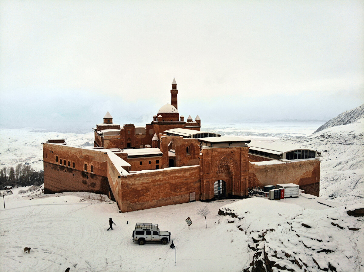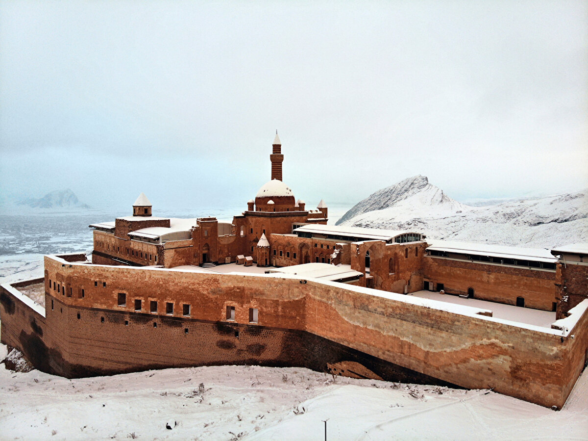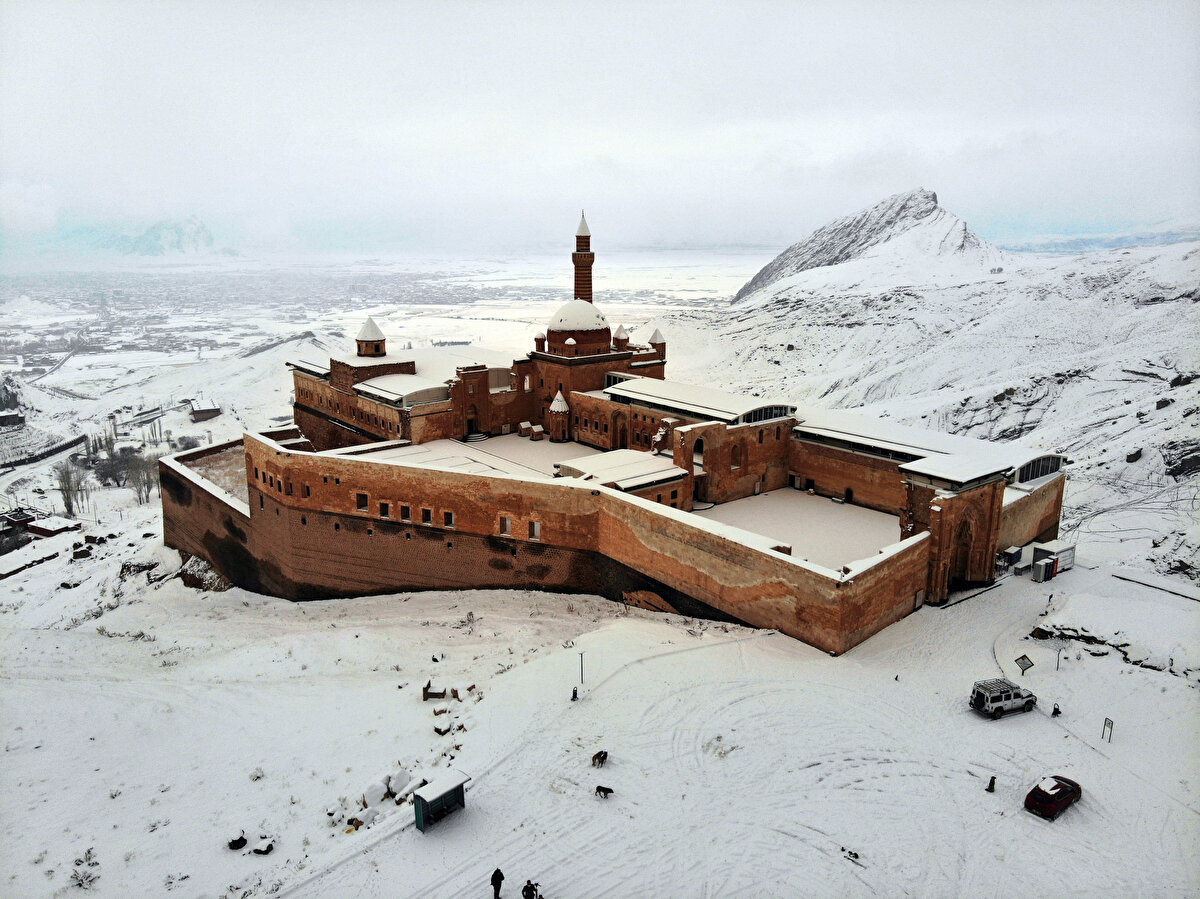 Yılın her mevsimi ayrı bir güzelliğe bürünerek ziyaretçilerini cezbeden İshak Paşa Sarayı, kış mevsiminin gelmesiyle bölgede etkili olan kar yağışı sonrası beyaz örtüyle kaplandı.
