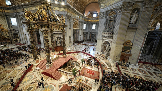 Vatikan'daki Aziz Petrus Bazilikası'nın ana sunağı önünde halkın ziyaretine açılan altıncı papa olan Francis, 1612'de tamamlanan tarihi yapının altında son yolculuğuna uğurlanıyor. Papa'nın naaşı, sade bir tabut içinde binlerce kişi tarafından ziyaret ediliyor.