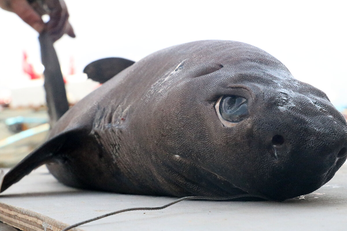 Antalya'nın Alanya ilçesinde balıkçı Hüseyin Hanlı, 700 metre derinlikte Pasifik kıyılarında yaşayan Ninja Lanternshark türü köpek balığı yakaladı.