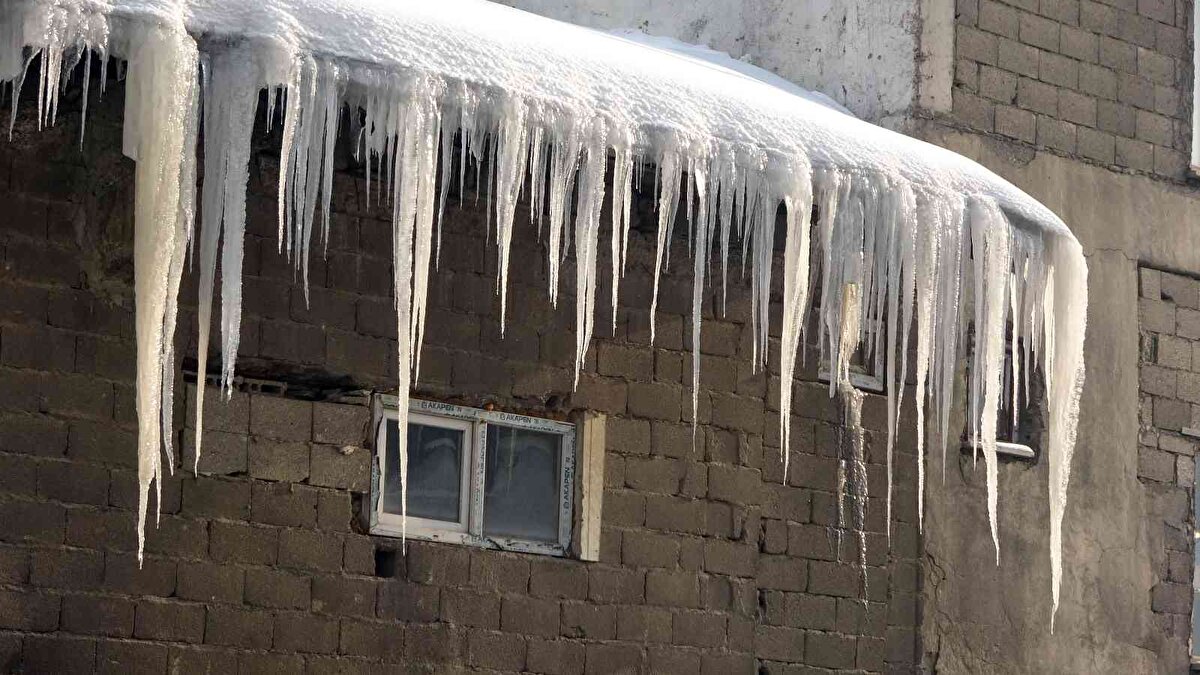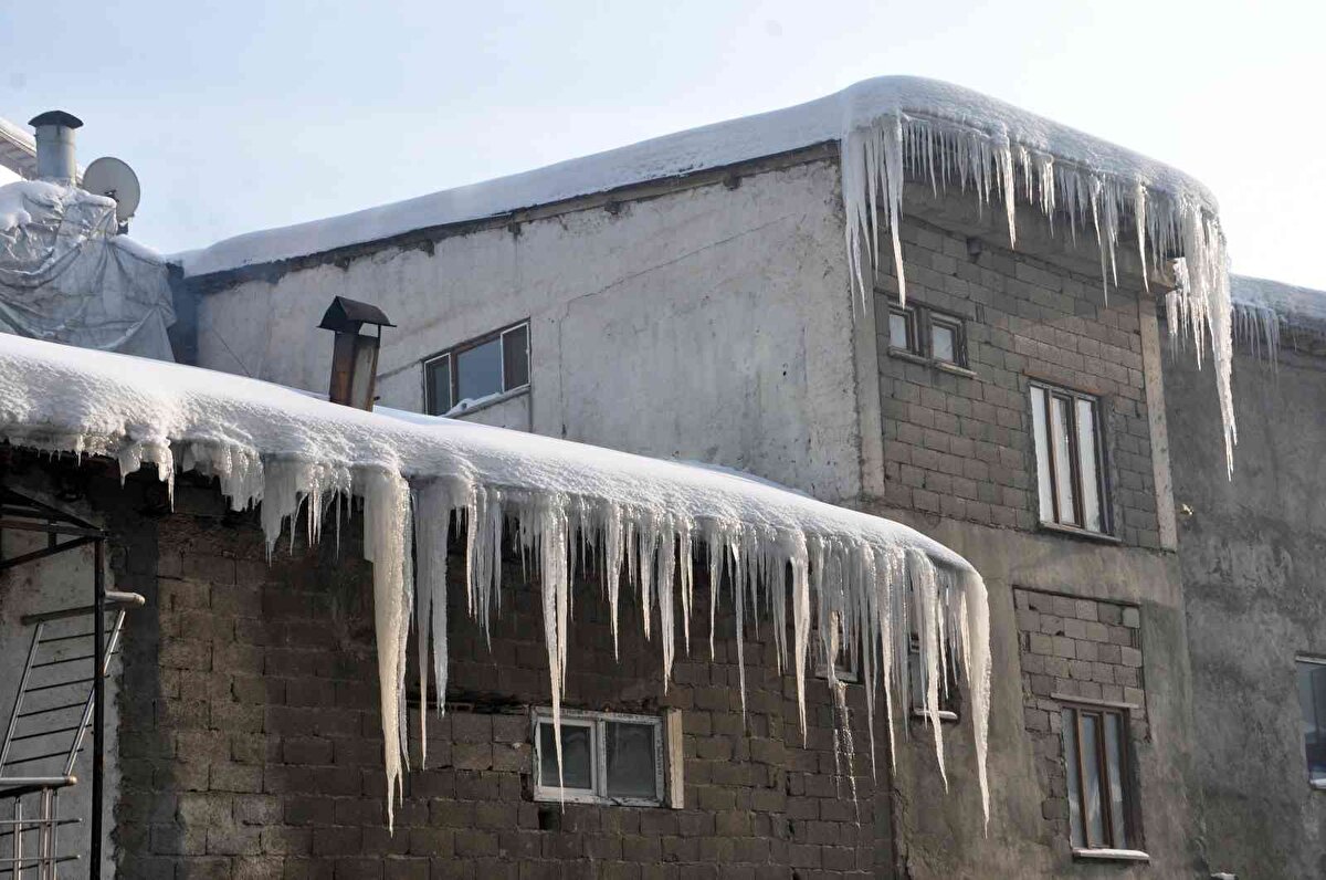 Derelerin donduğu buz sarkıtlarının uzunluğu beş metreyi bulduğu ilçede, bina sahipleri de buzları kürek yardımıyla temizlemeye çalışıyor.
