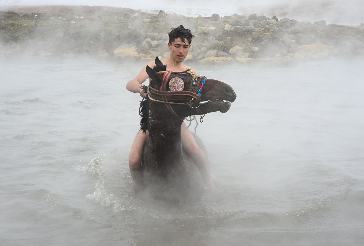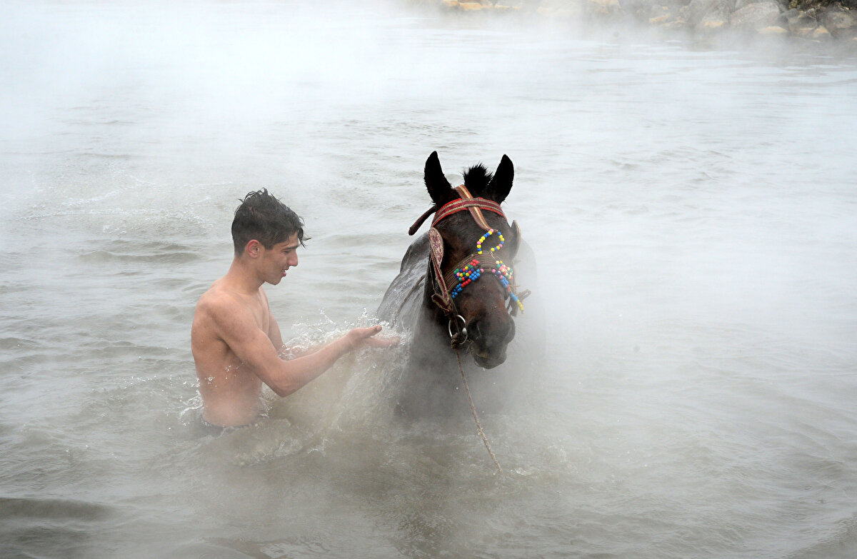 Bitlis'in Güroymak ilçesinde manda yetiştiricileri, kışın ahırlarda kirlenen hayvanlarını belirli aralıklarla götürdükleri kaplıcada yıkıyor.