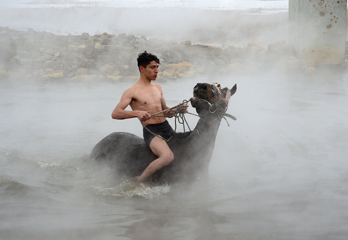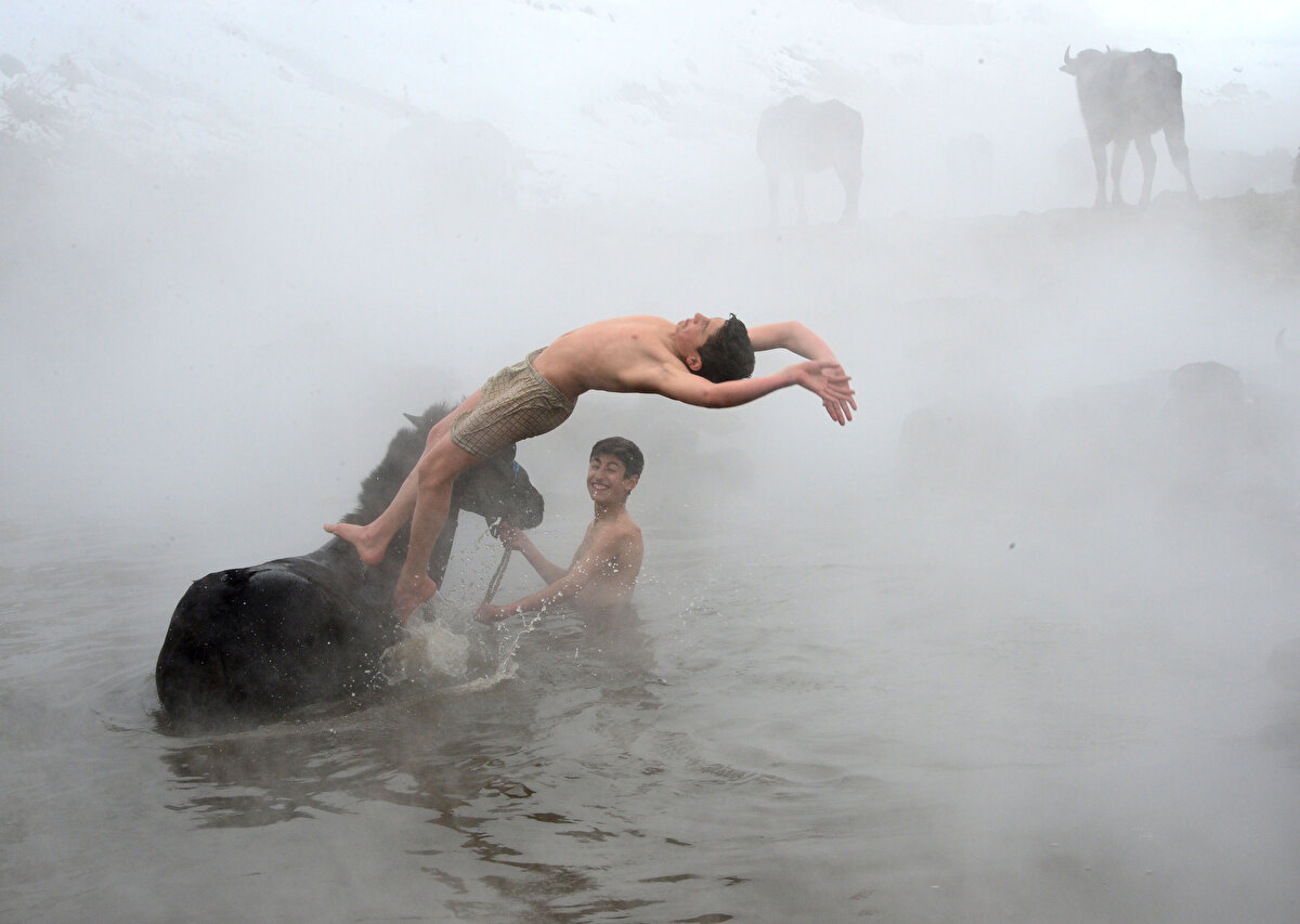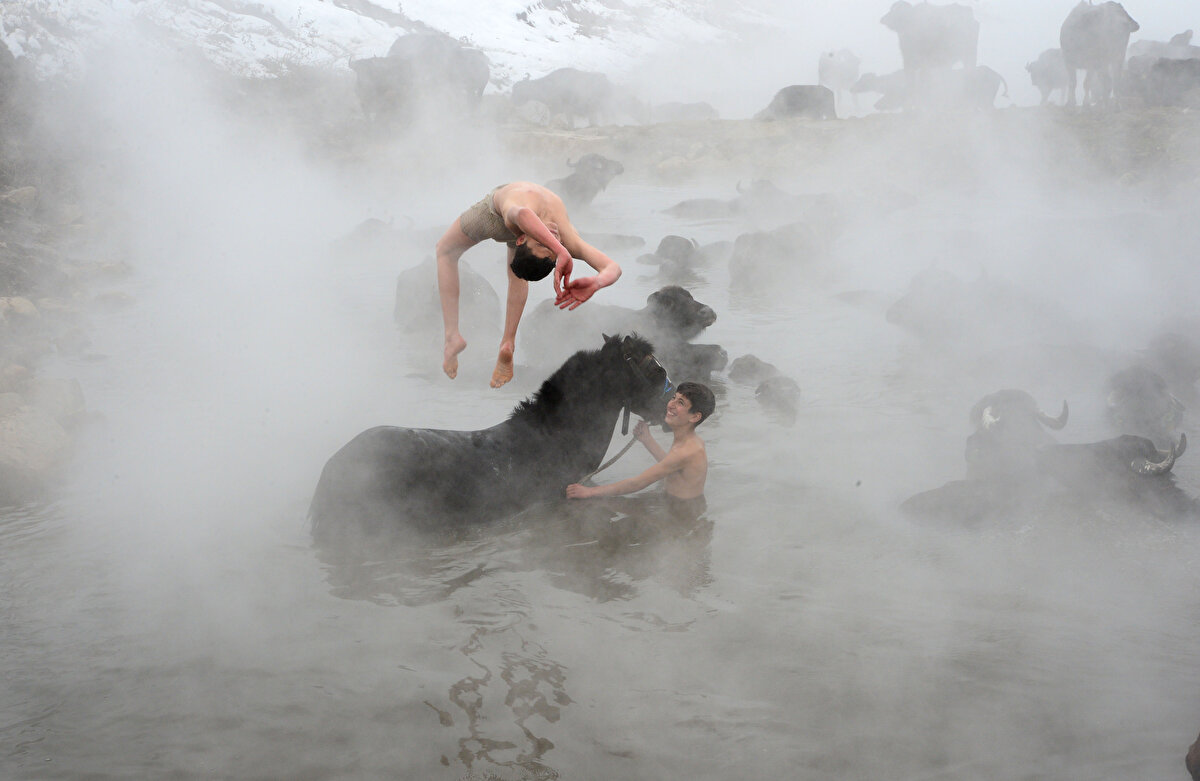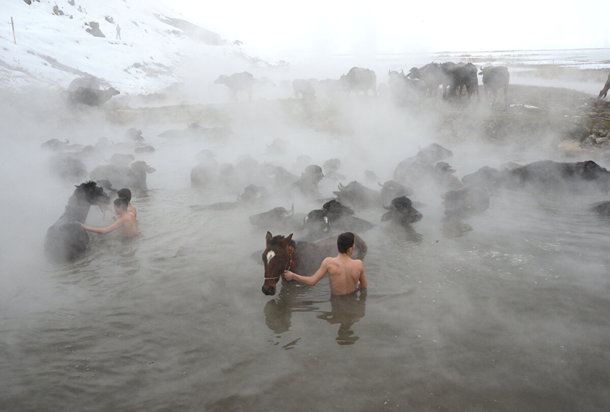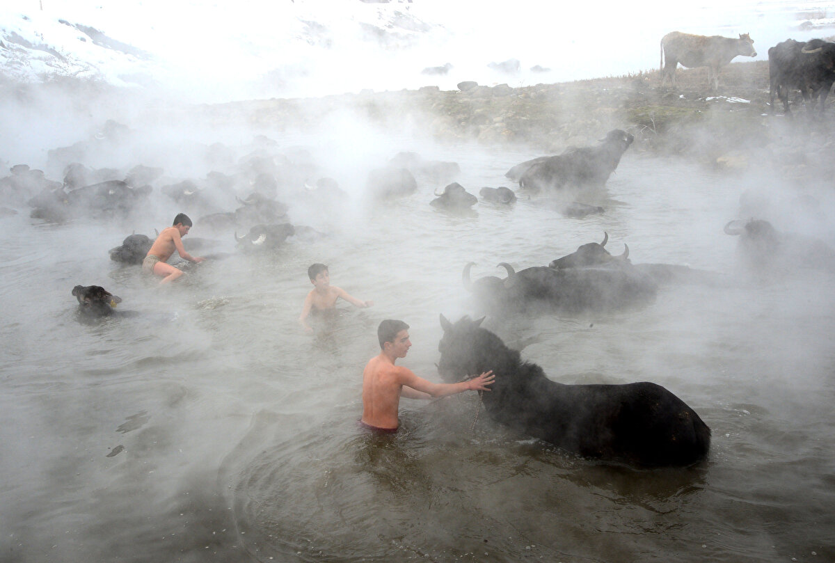 Hava sıcaklıklarının - 20 dereceye kadar düştüğü Bitlis'in Güroymak ilçesinde manda yetiştiricileri, kışın ahırlarda kirlenen hayvanlarını belirli aralıklarla götürdükleri kaplıcada yıkıyor.