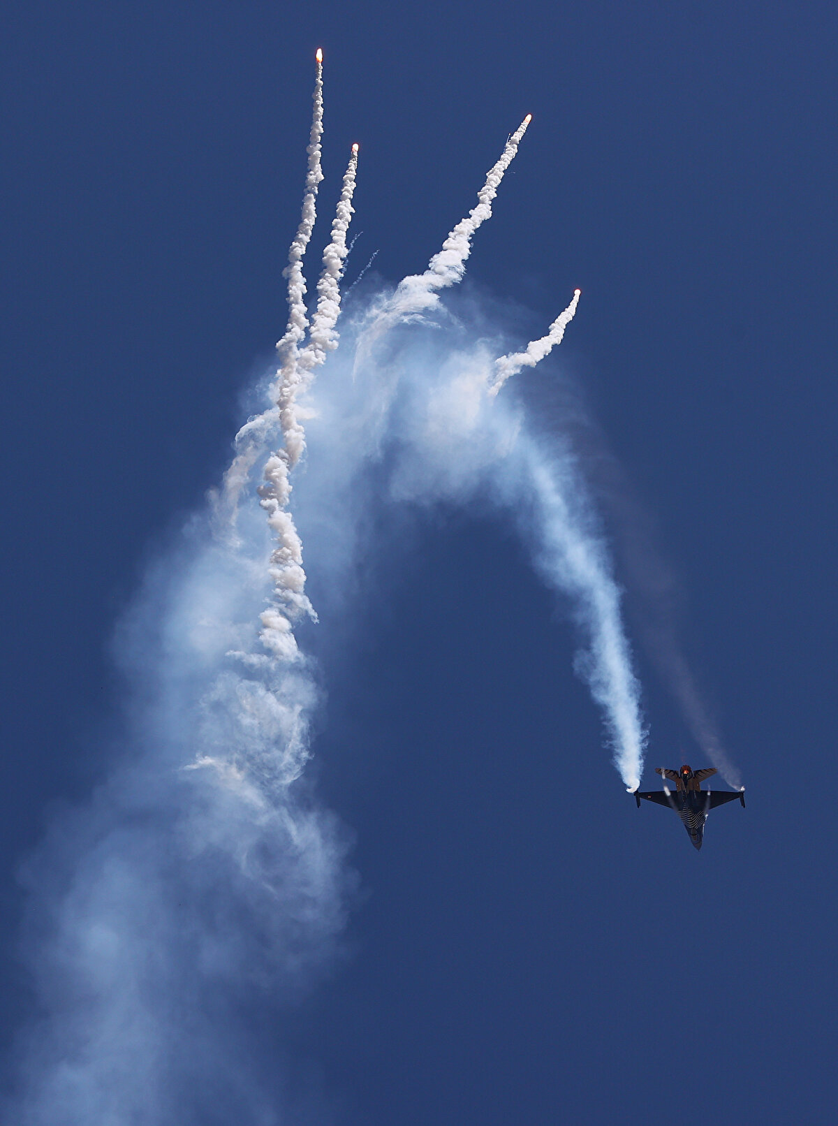 Türk Hava Kuvvetleri'nin (THK) gösteri timi SOLOTÜRK, 'Kobra Manevrası' olarak bilinen 'Alçak irtifada en düşük hızda uçağın burun yukarı şahlandırılarak düz uçuşun muhafaza edilmesi' hareketini dünyada ilk kez F-16 savaş uçağıyla gerçekleştiren gösteri ekibi oldu.