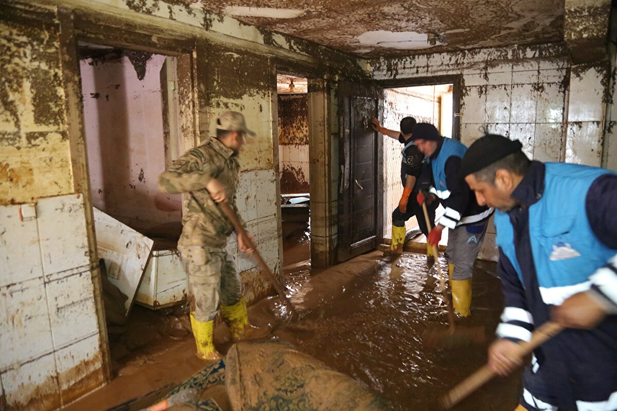 Sağanağın ardından taşan Karakoyun Deresi çevresindeki bölgelerde oluşan çamur tabakalarını temizleme ve su tahliye çalışmaları, asker ile korucuların desteğiyle yürütülüyor.