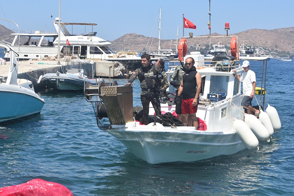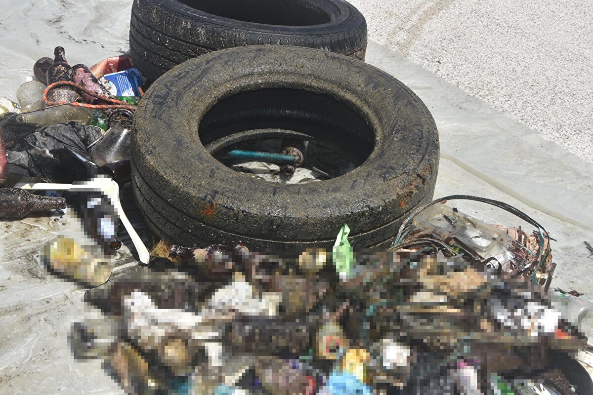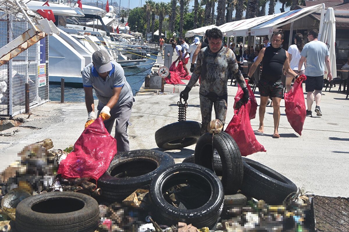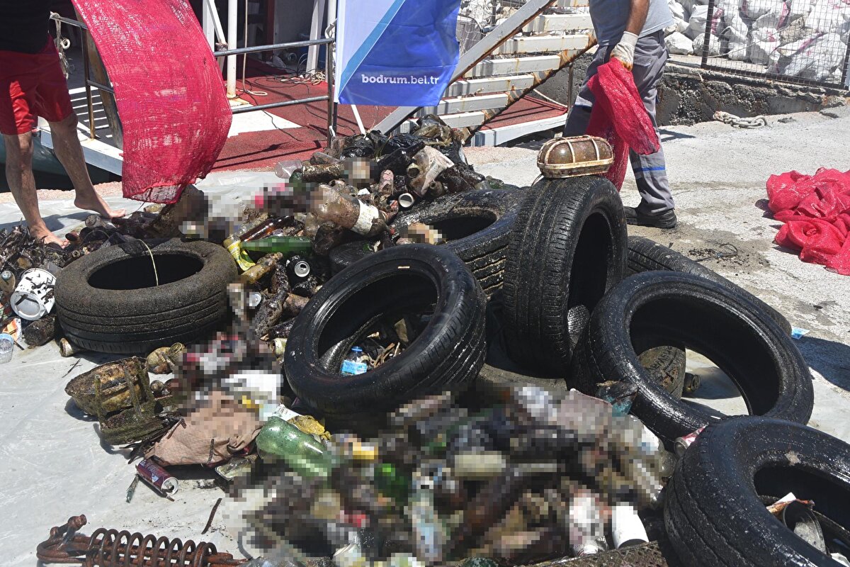 Muğla'nın Bodrum ilçesinde yapılan deniz dibi temizliğinde araç lastiği, cam ve pet şişeler ile cep telefonunun da olduğu 500 kilo atık çıktı.