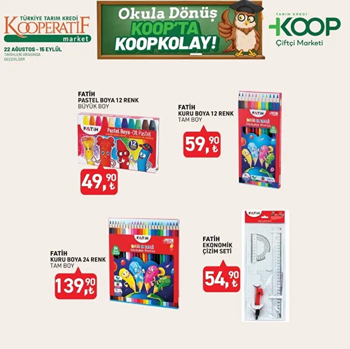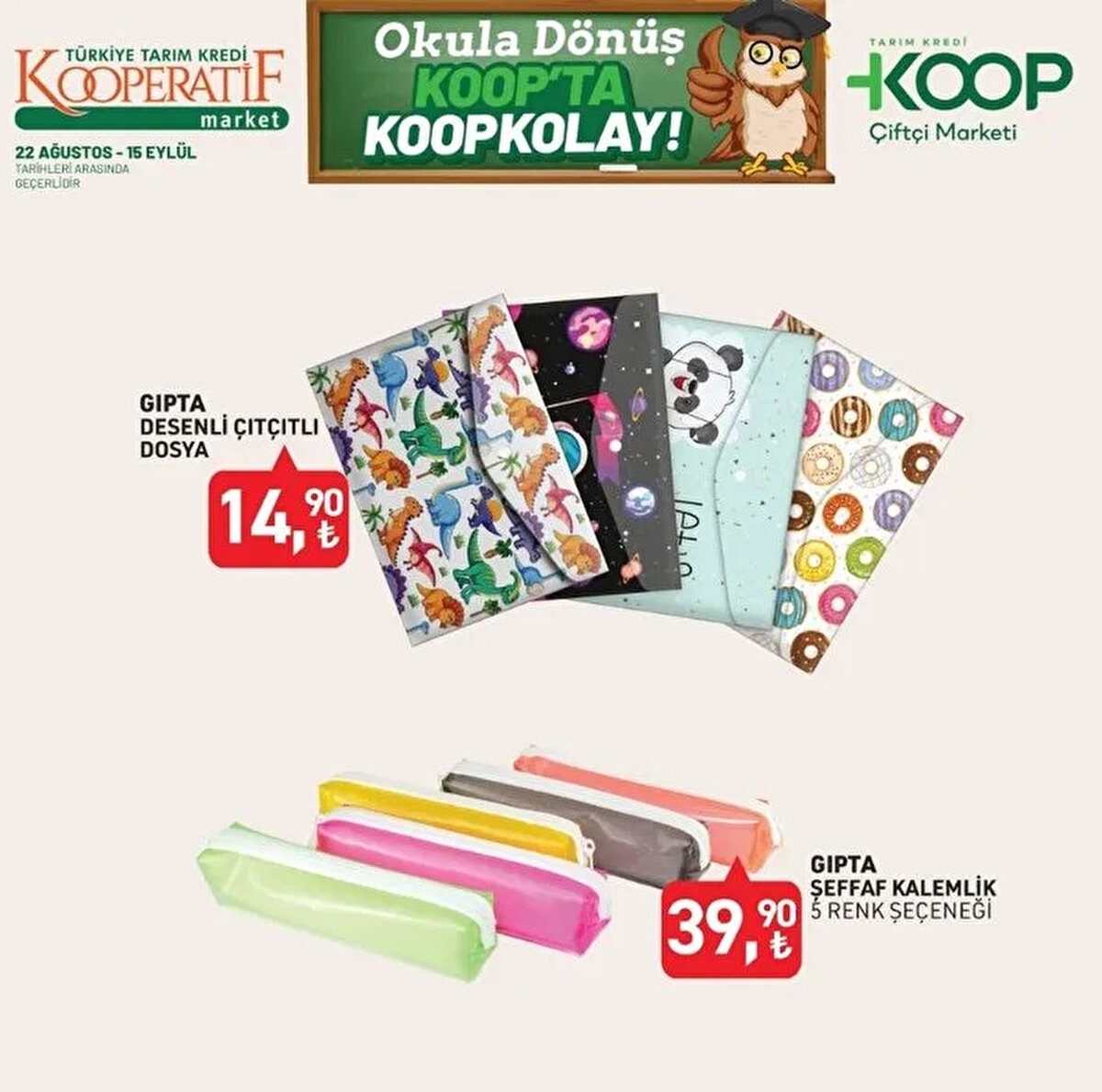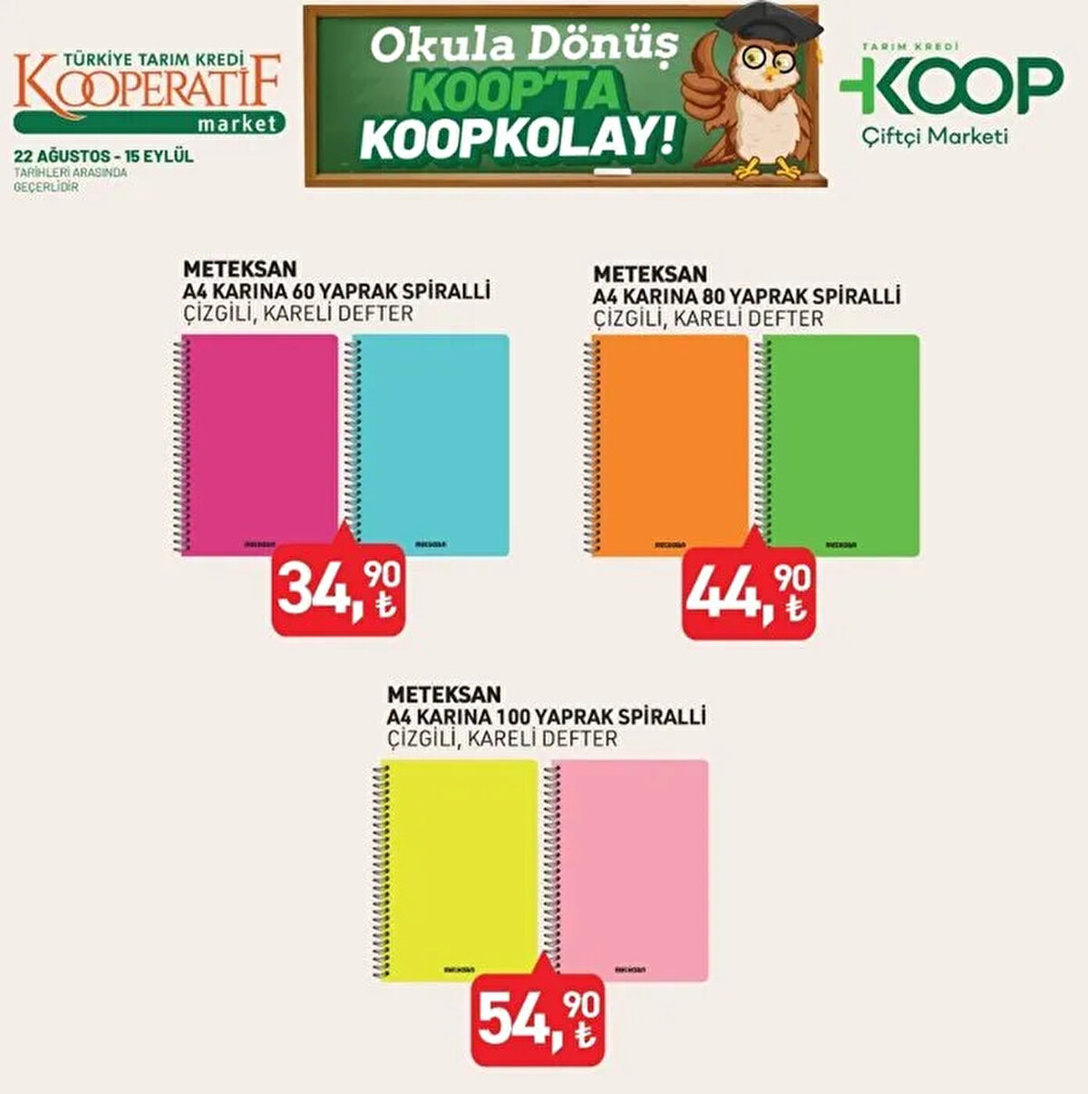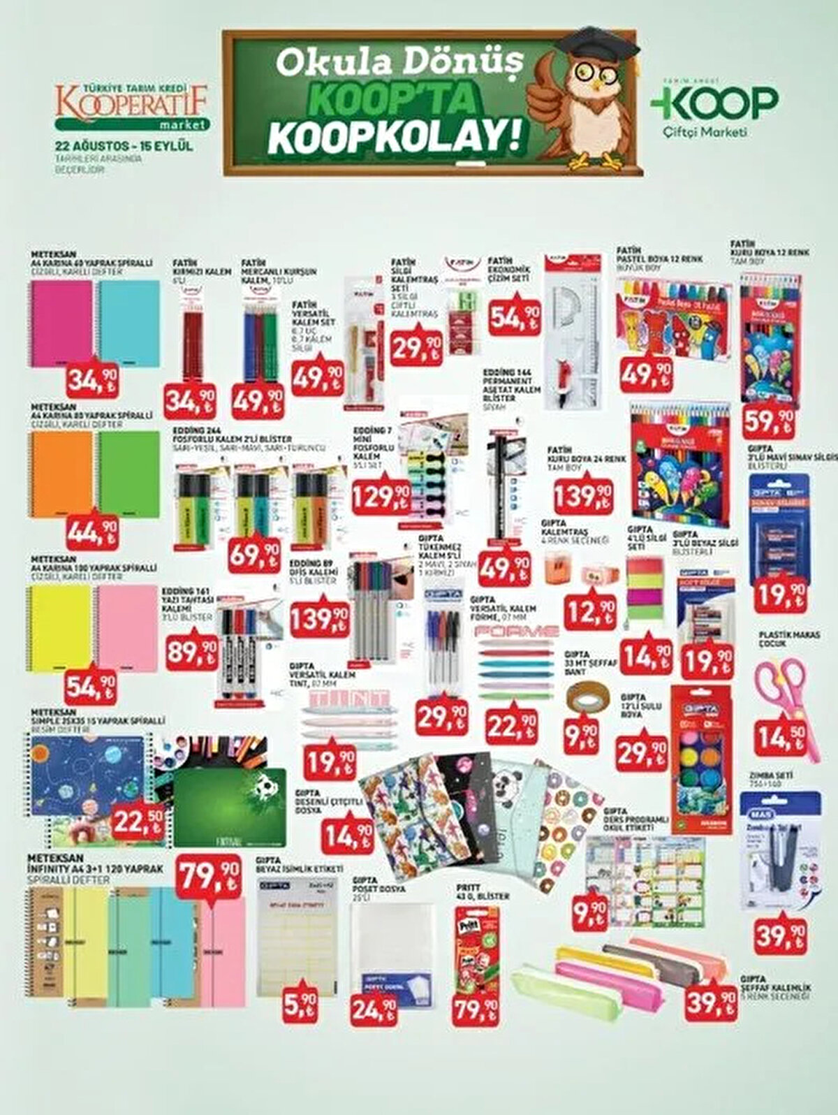 Tarım Kredi Kooperatif Market, yeni eğitim öğretim yılı öncesi veliler ve öğrenciler için büyük indirim kampanyası başlattı. 22 Ağustos – 15 Eylül 2025 tarihleri arasında geçerli olacak aktüel kırtasiye kataloğunda defterden kaleme, boyadan dosya çeşitlerine kadar yüzlerce ürün cazip fiyatlarla satışa sunuluyor.
