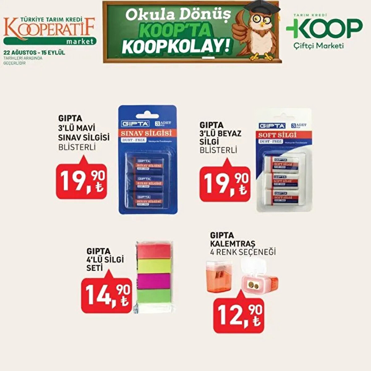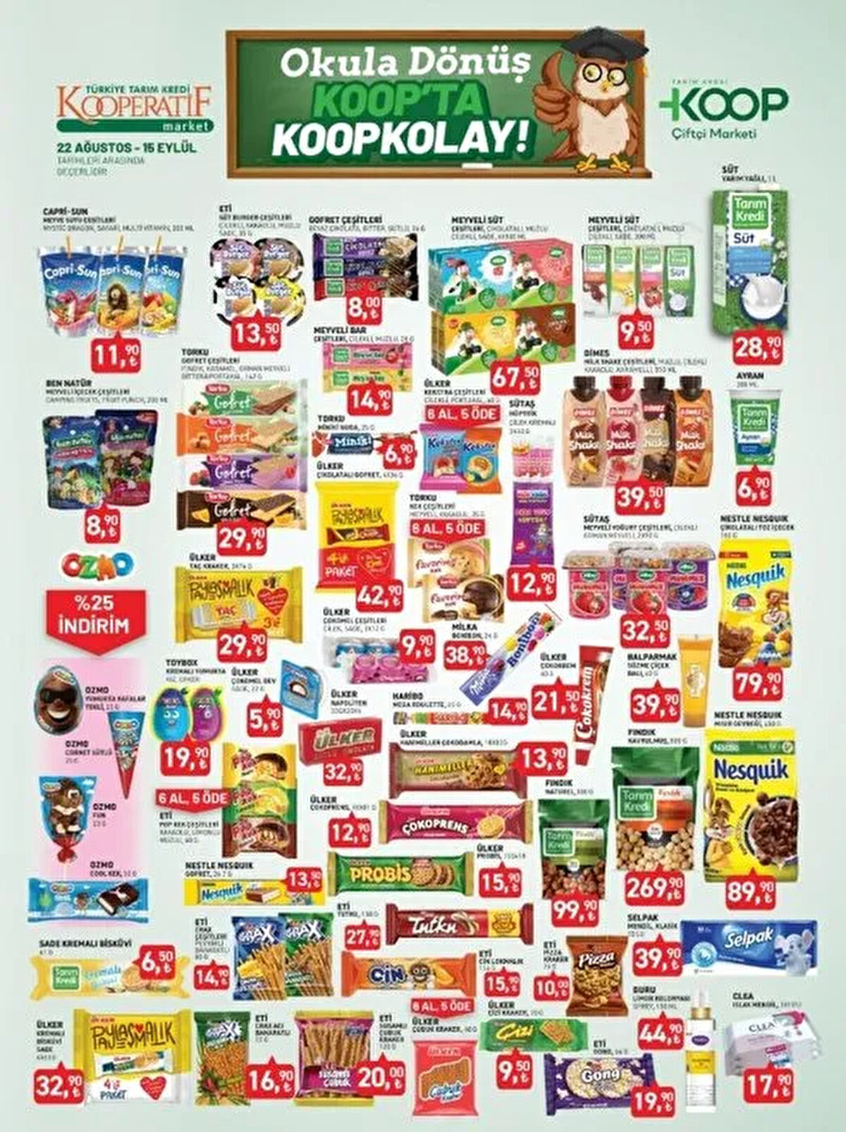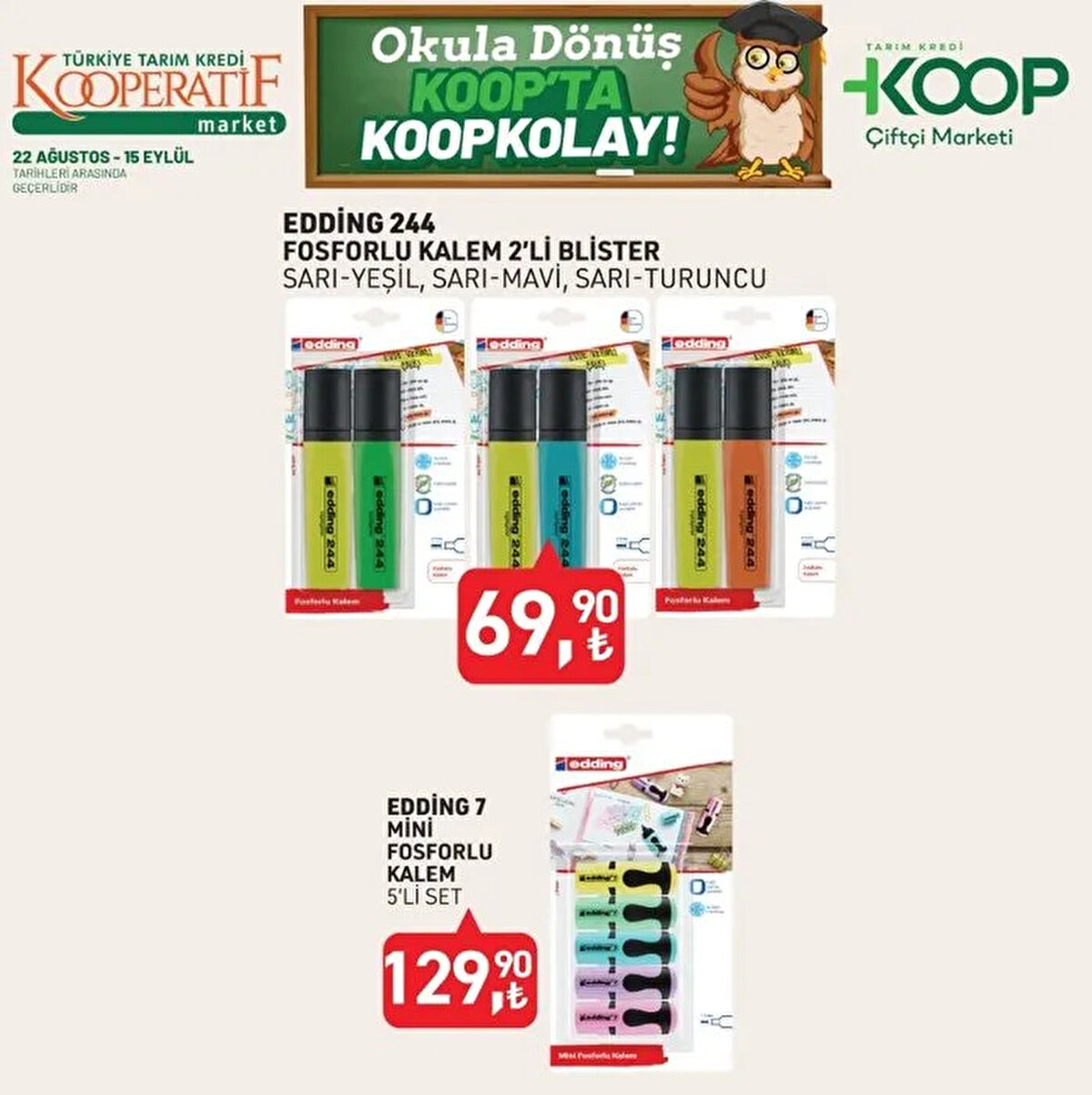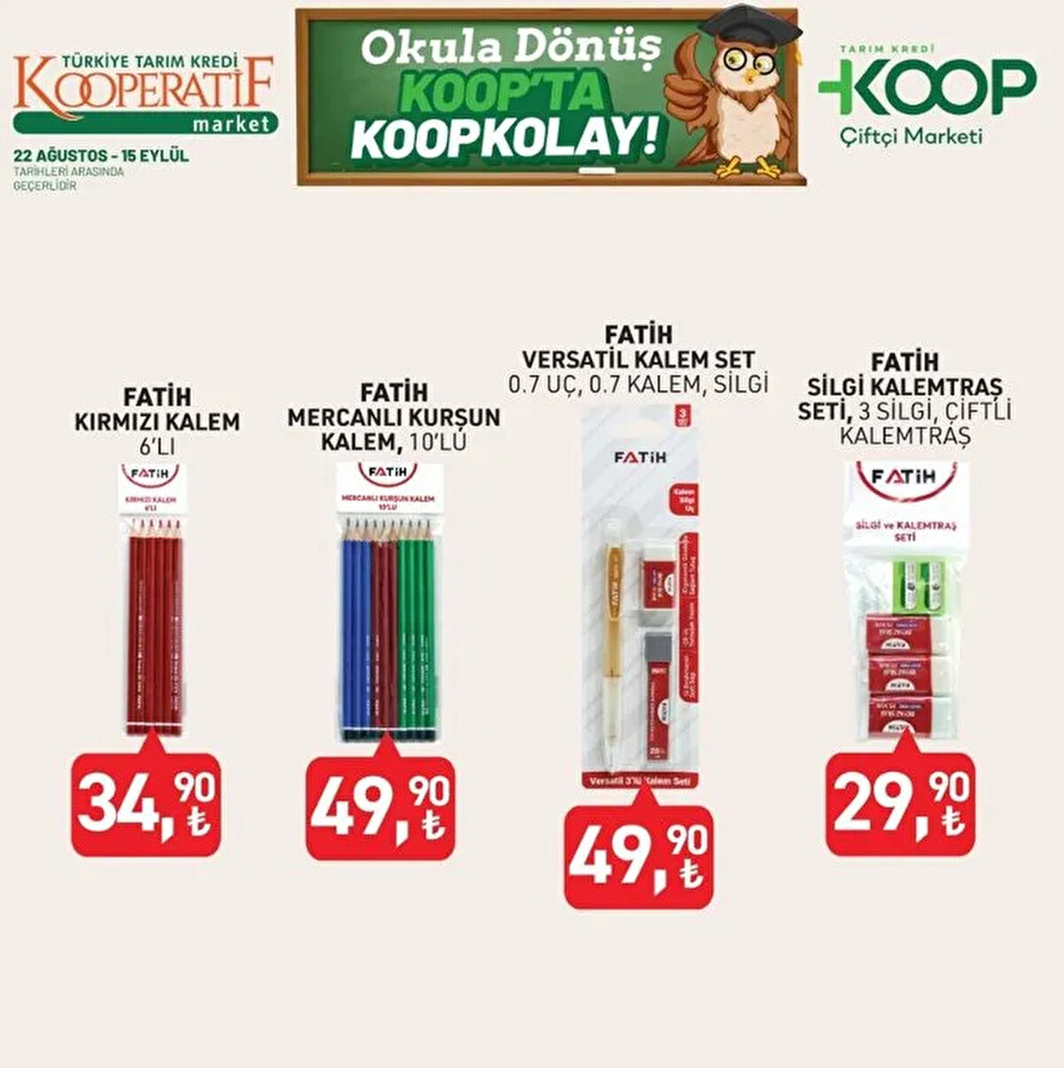 Tarım Kredi Kooperatif Market, yeni eğitim öğretim yılı öncesi veliler ve öğrenciler için büyük indirim kampanyası başlattı. 22 Ağustos – 15 Eylül 2025 tarihleri arasında geçerli olacak aktüel kırtasiye kataloğunda defterden kaleme, boyadan dosya çeşitlerine kadar yüzlerce ürün cazip fiyatlarla satışa sunuluyor.