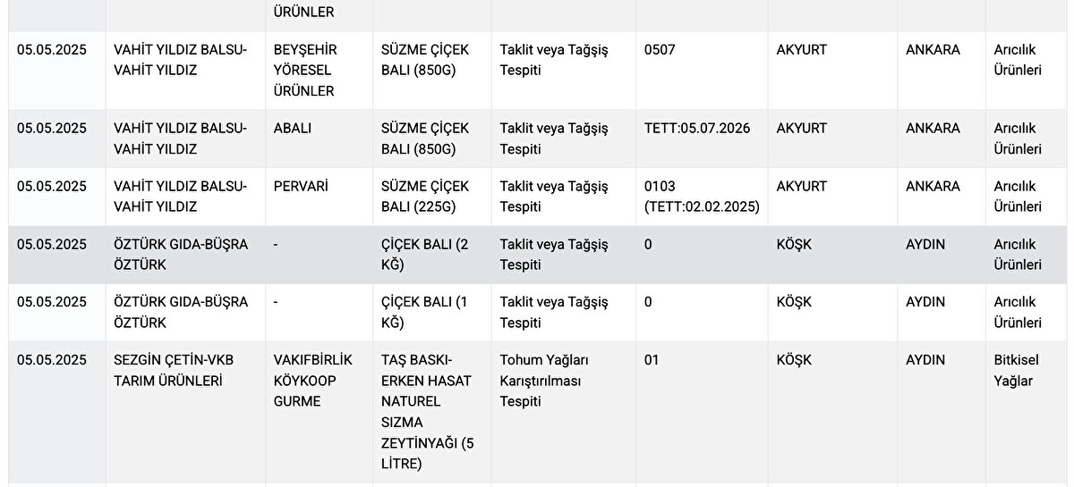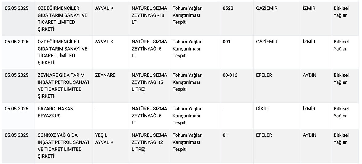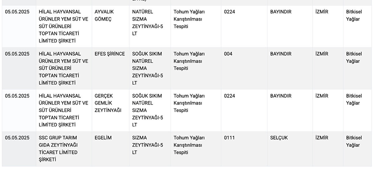 Listeye yeni eklenen markalarda; zeytinyağı ürünlerine tohum yağı karıştırılması, peynirde yağ oranının düşük olması, balda hile gibi uygunsuzluklar tespit edildi.