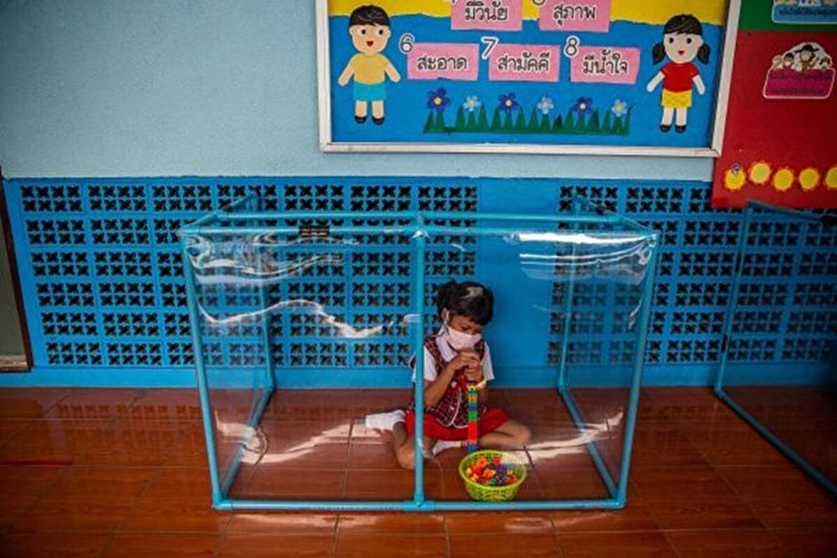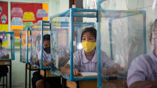 Koronavirüs salgını nedeniyle eğitim-öğretimin nasıl sürdürüleceği tartışmaları devam ederken Tayland'da okullar yeniden faaliyete başladı. Maske takmanın zorunlu olduğu okullarda, sıraların arasına da paravanlar konuldu.