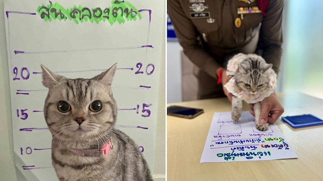 Tayland'da sokakta bulunarak karakola teslim edilen kedinin polisleri defalarca ısırmasının ardından, mizah amaçlı sabıka fotoğrafı çekildi ve pati izleri alındı.