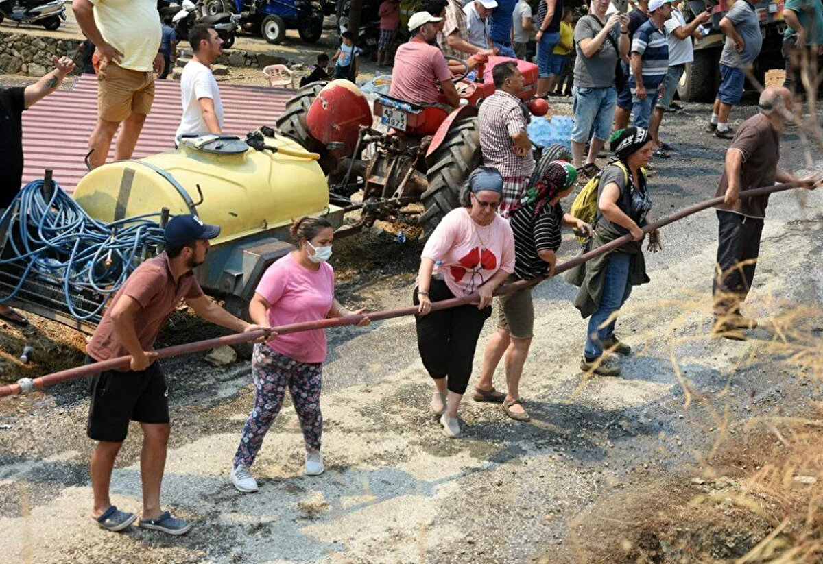 Türkiye yangınlara karşı tek yürek oldu. Fethiye'de eline pet şişeleri alanlar, alevlere su dökmeye koştu. Marmaris'te vatandaşlar dağlara su, yiyecek, erzak ve ilk yardım ekipmanı taşıdı. Gençler de bidonları motorsikletlerine yükleyip yangın yerlerine su götürdü.