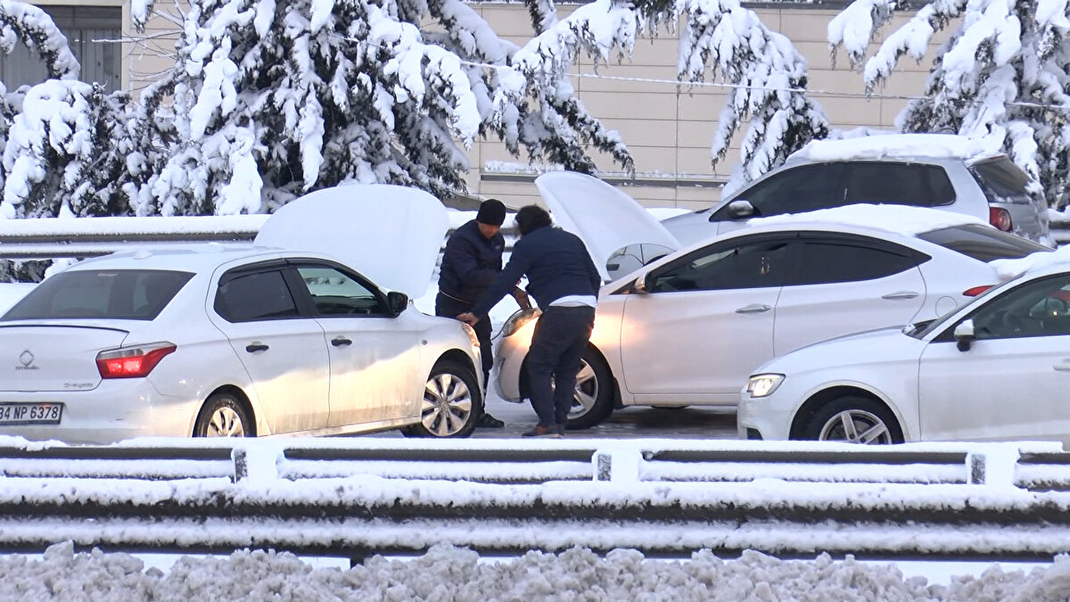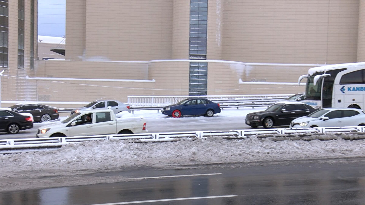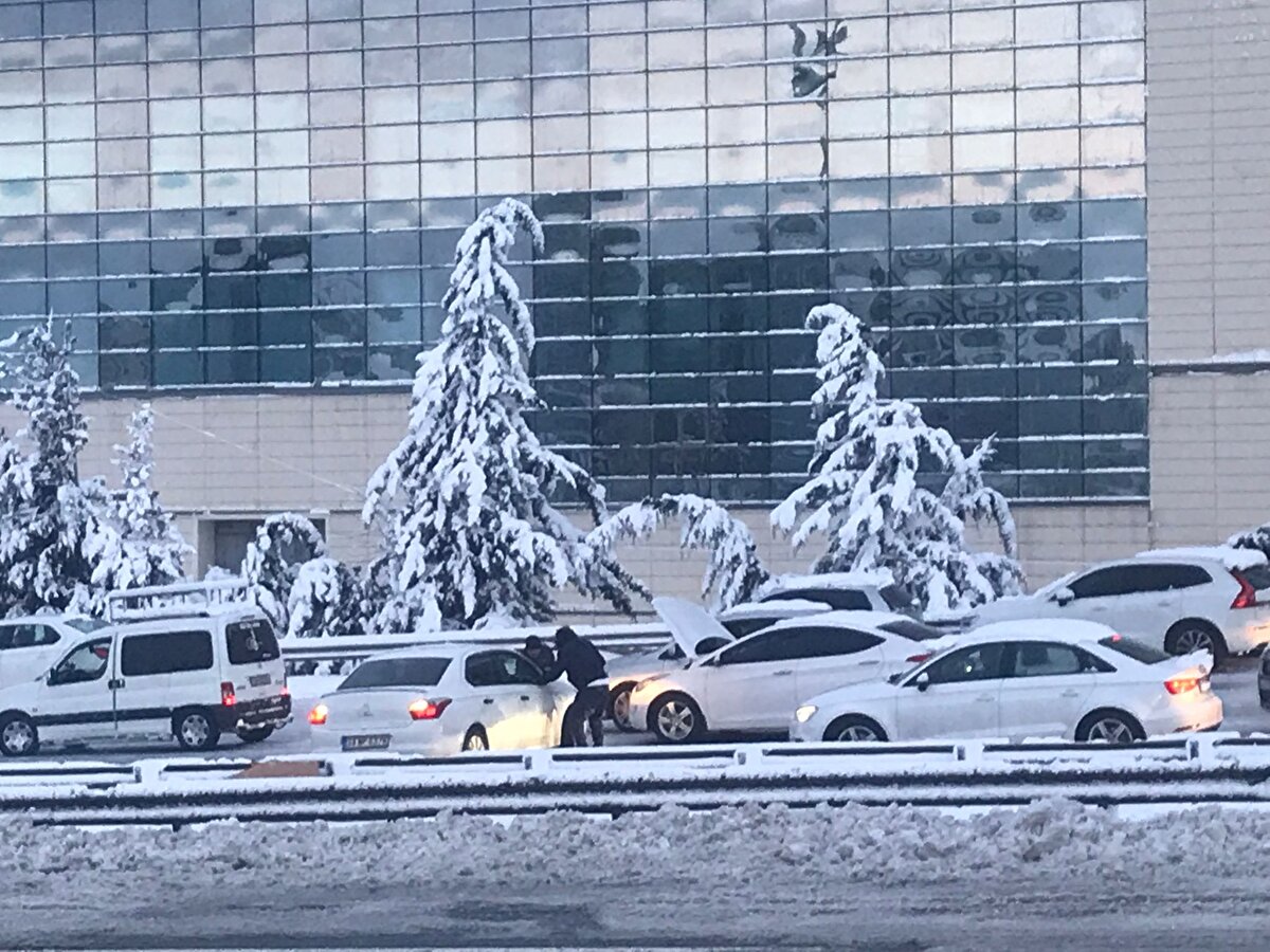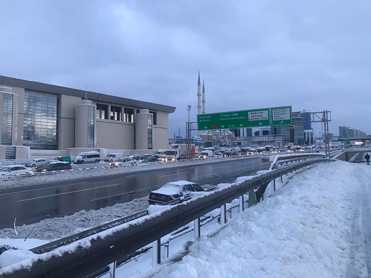 TEM Otoyolu İSTOÇ mevkiinde kar esareti dün geceden beri devam ediyor. Uzun araç kuyruklarının oluştuğu yolda trafik durmuş durumda. Yol adeta buz pistine döndü.