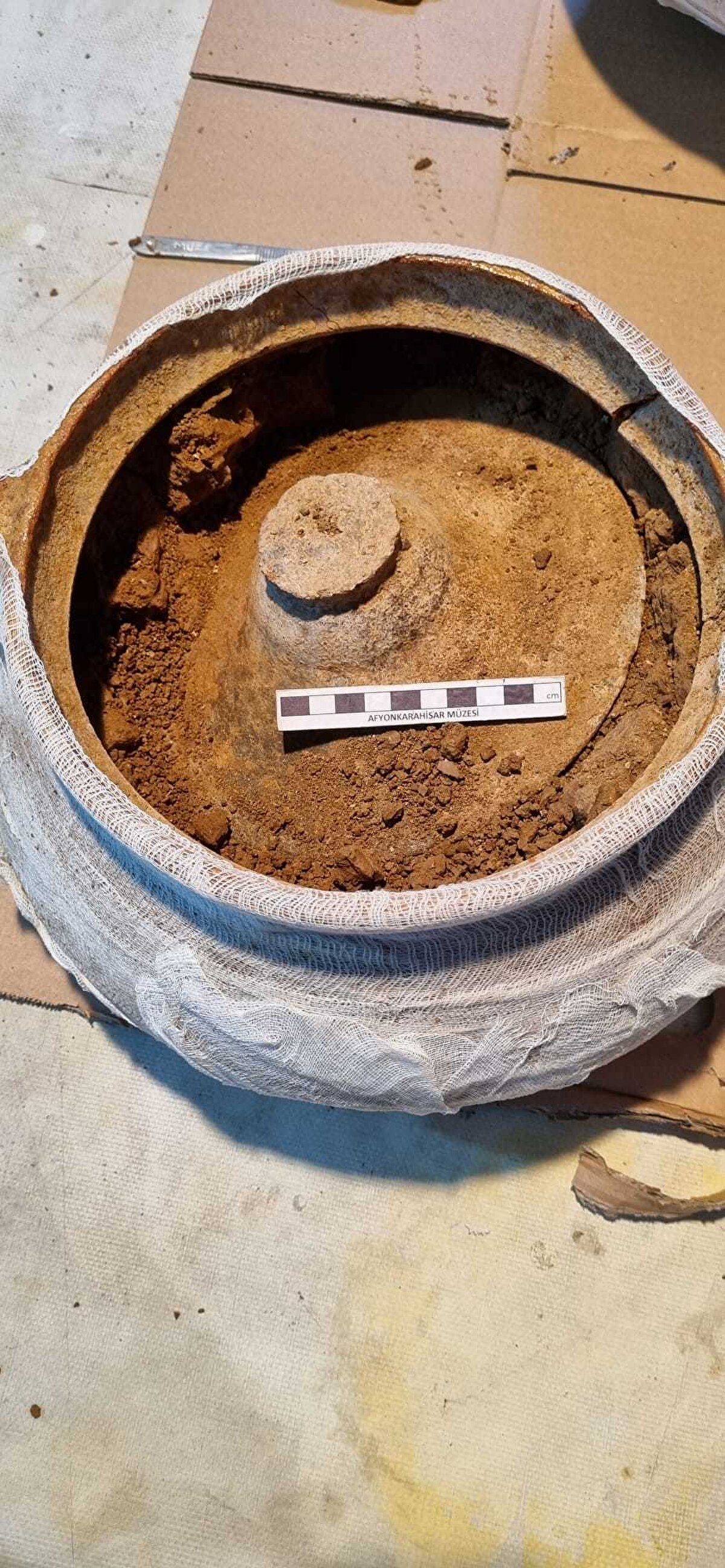 Afyonkarahisar'ın Dinar ilçesinde bulunan lahitten çıkan 4 çömlek kül kabı Müze Müdürlüğü'nde açıldı.
