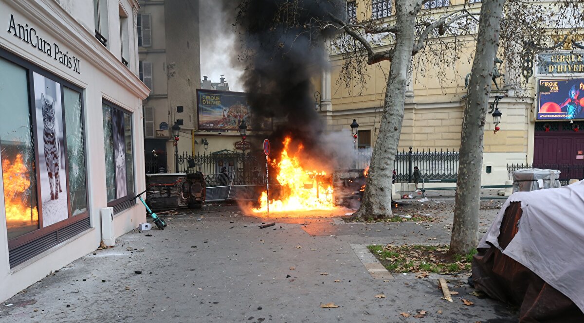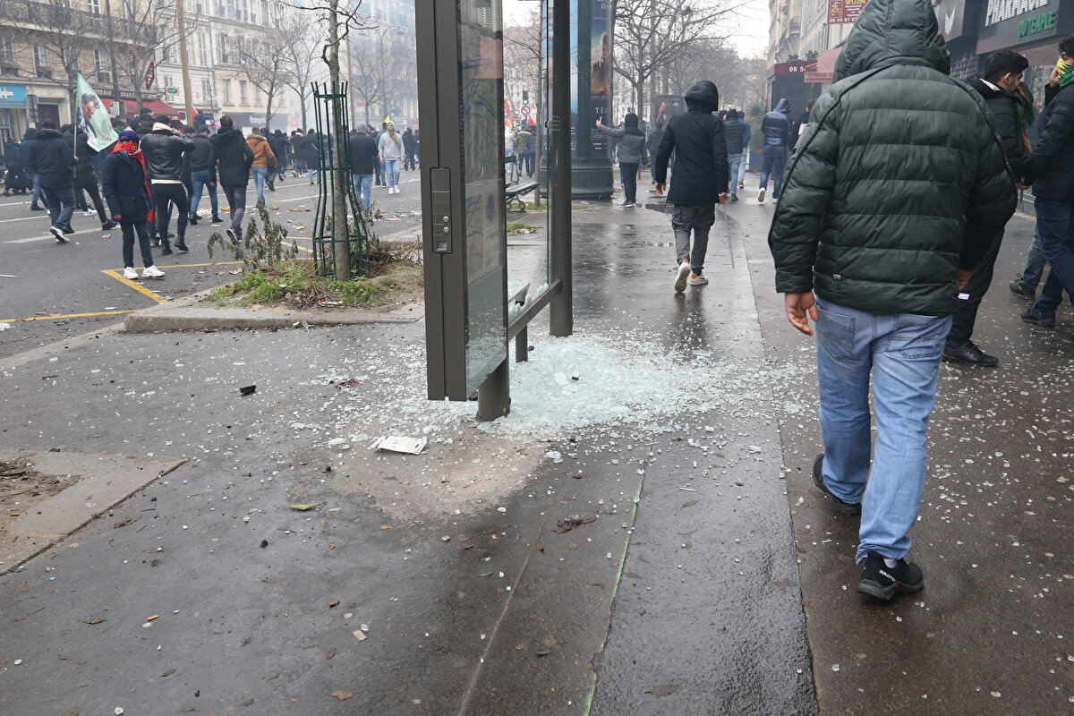 Paris'teki gösteride çoğu yüzünü maskeyle kapatan, havai fişek ve maytaplarla da adeta ortalığı savaş alanına çeviren PKK yanlısı saldırganlar, otobüs duraklarını tahrip ederken, sivillere ait çok sayıda otomobil ve motosikleti ters çevirerek ateşe vermişti.
