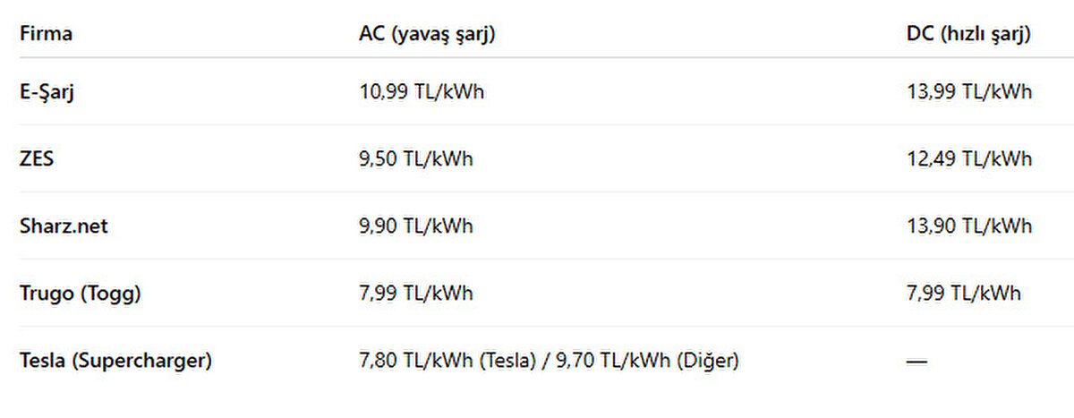 26 Temmuz 2025 itibarıyla Türkiye genelinde öne çıkan bazı şarj istasyonlarının güncel AC (yavaş şarj) ve DC (hızlı şarj) fiyatları ise şöyle: