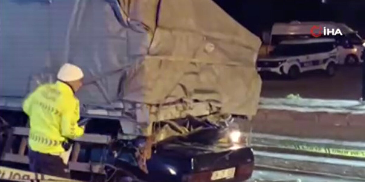 Tırın dorsesinin altına giren kağıt gibi ezilen otomobil tırla birlikte 20 metre sürüklendi. İhbar üzerine bölgeye polis, sağlık ve itfaiye ekipleri sevk edildi.