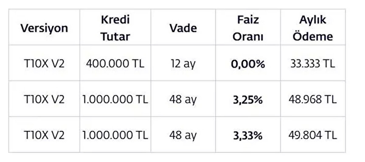 Togg’un Haziran ayı kampanya duyurusuna göre, T10X modeli için hem bireysel hem de kurumsal alıcılara özel 12 ay vade ve yüzde 0 faiz avantajı sunuluyor. Kampanya kapsamında 400.000 TL tutarındaki krediler için bu faizsiz ödeme planı geçerli olacak.