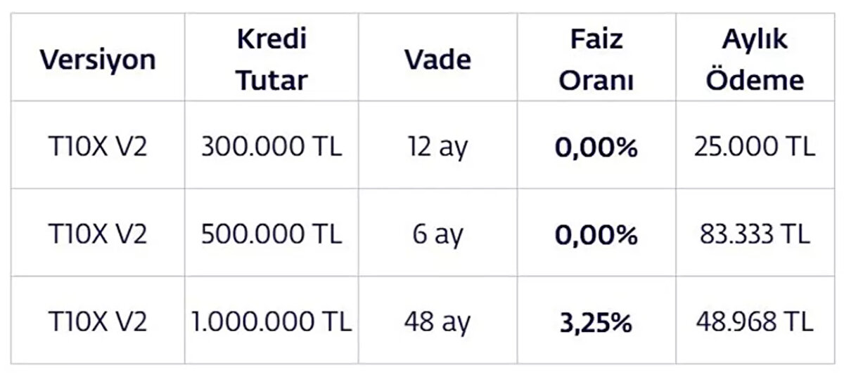 Kampanya kapsamında, peşinatın yanı sıra faizsiz ayda 25.000 TL taksitle T10X SUV otomobil sahibi olunabileceği anlaşıldı.