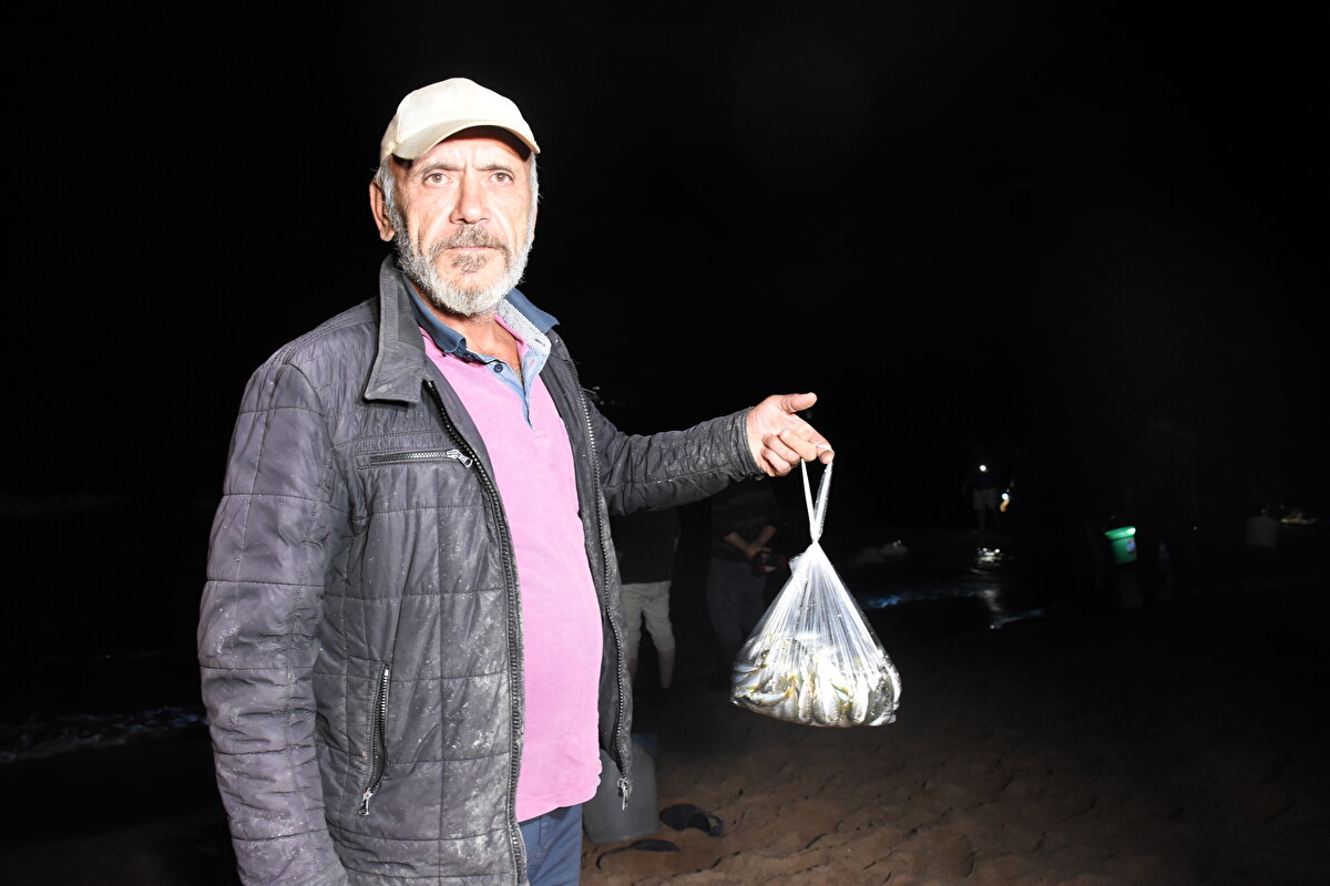 Kadını erkeği çok sayıda vatandaşın ellerinde fenerlerle kıyıda biriken balıkları topladığı anlar ilginç görüntü oluşturdu.