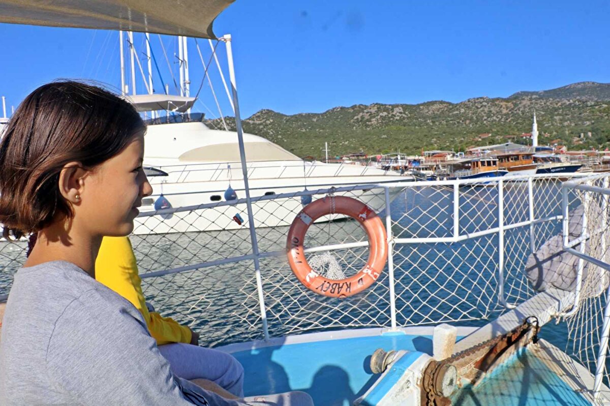 Yolculuk güzergahı Kekova koyu olduğu için fırtına gibi bir engelle de karşılaşmayan öğrenciler kamaralı tekneleriyle güvenli bir yolculuk yapıyor.