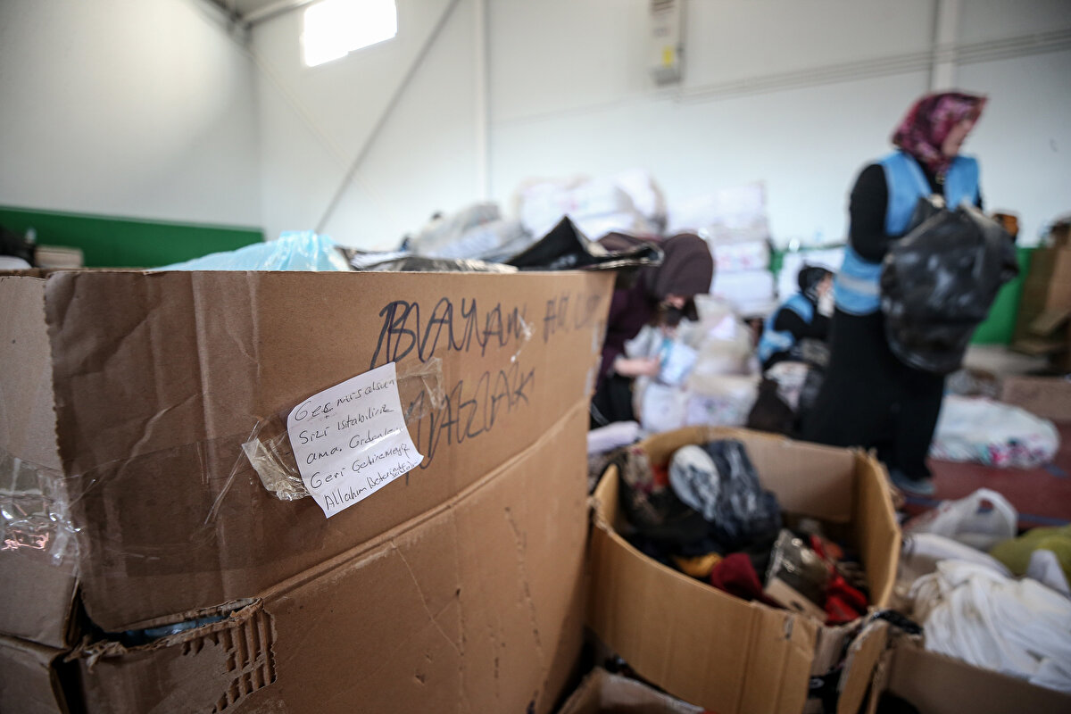Diyanet İşleri Başkanlığı Hatay Lojistik Merkezi'ne gönderilen insani yardım malzemelerinin tasnif ve ihtiyaca göre sevki, çoğunluğu gönüllülerden oluşan ekip tarafından yapılıyor.