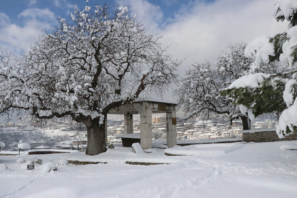 Tarihi ilçedeki Osmanlı döneminden kalma han, hamam, cami, çeşme ve konaklar, yağan karın ardından beyaz örtüyle kaplandı.