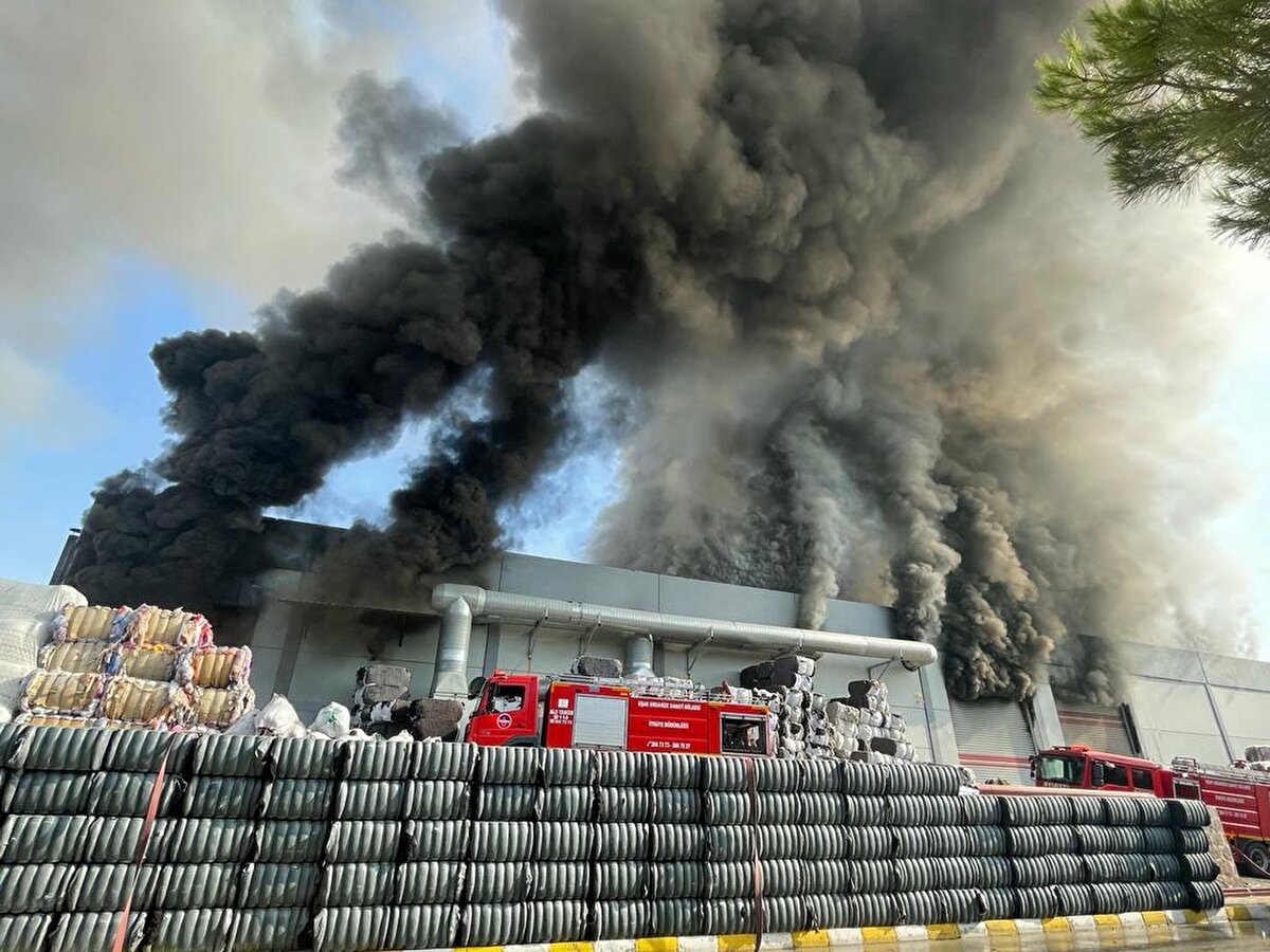 Yoğun duman yükselen fabrikadaki yangının söndürülmesi için çok sayıda ekip çalışma yürütüyor.