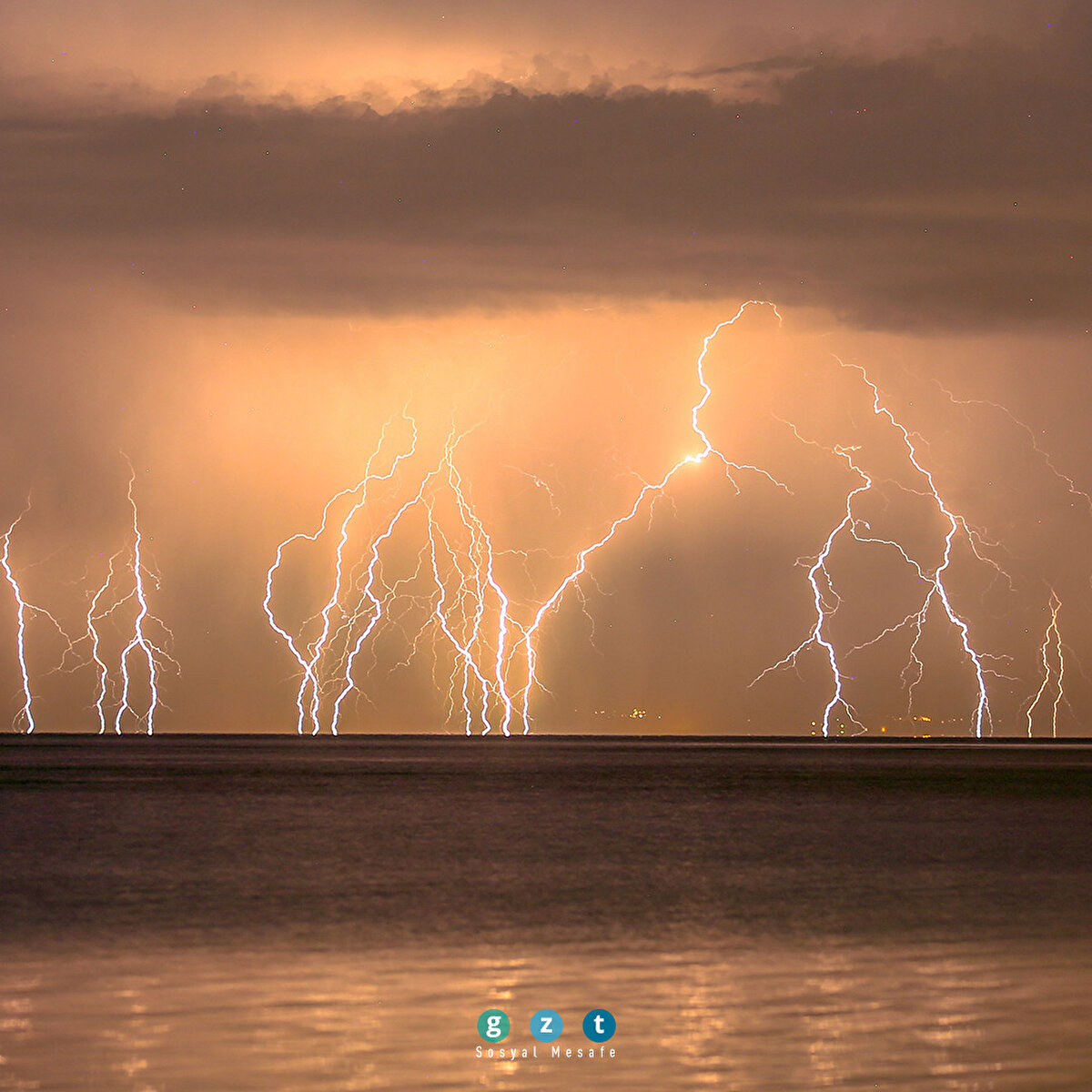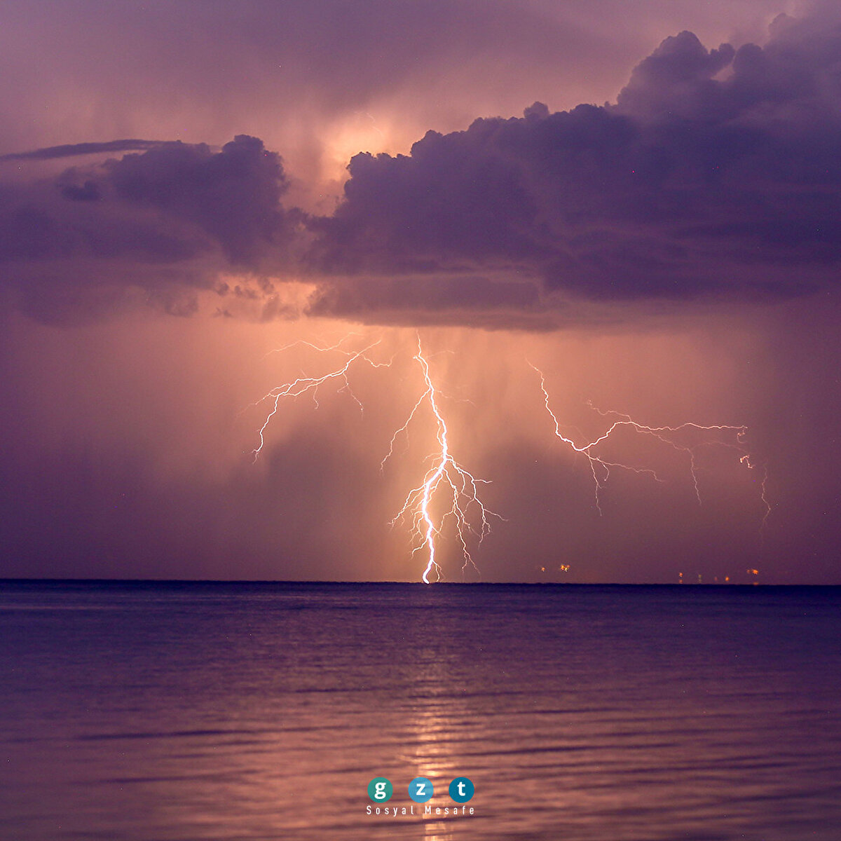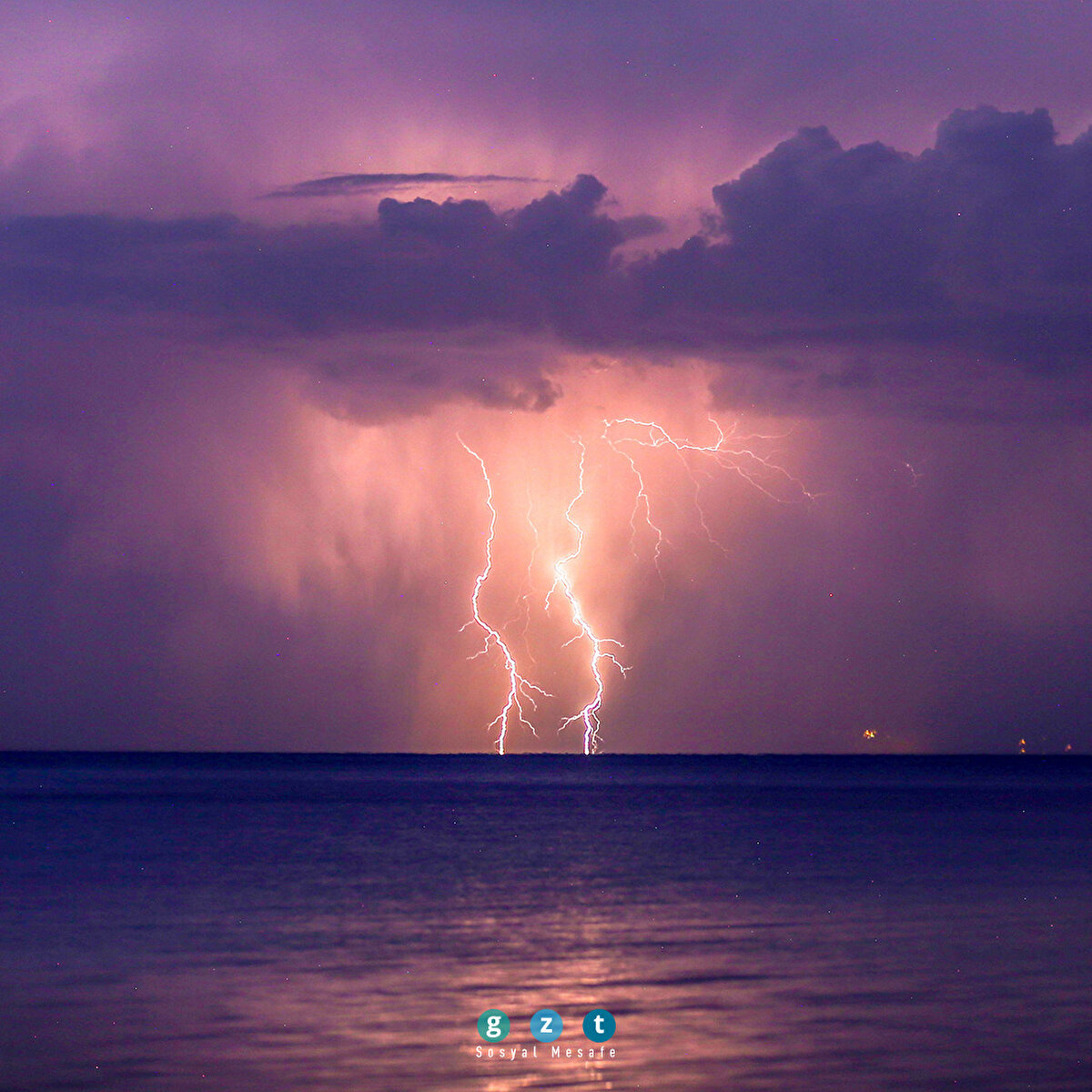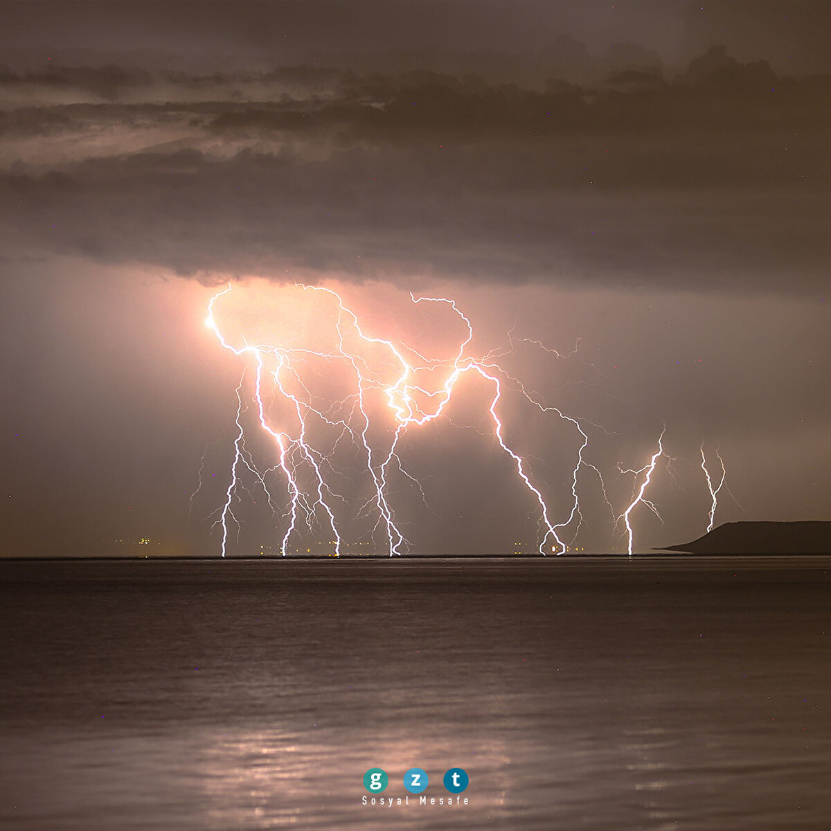 Van'da akşam saatlerinde etkili olan yağmurla birlikte çakan şimşekler Van Gölü semalarını aydınlatttı.