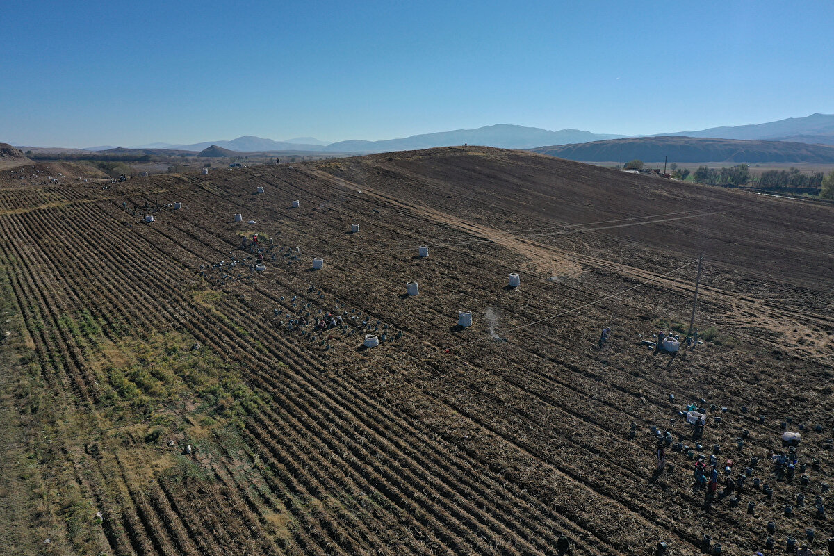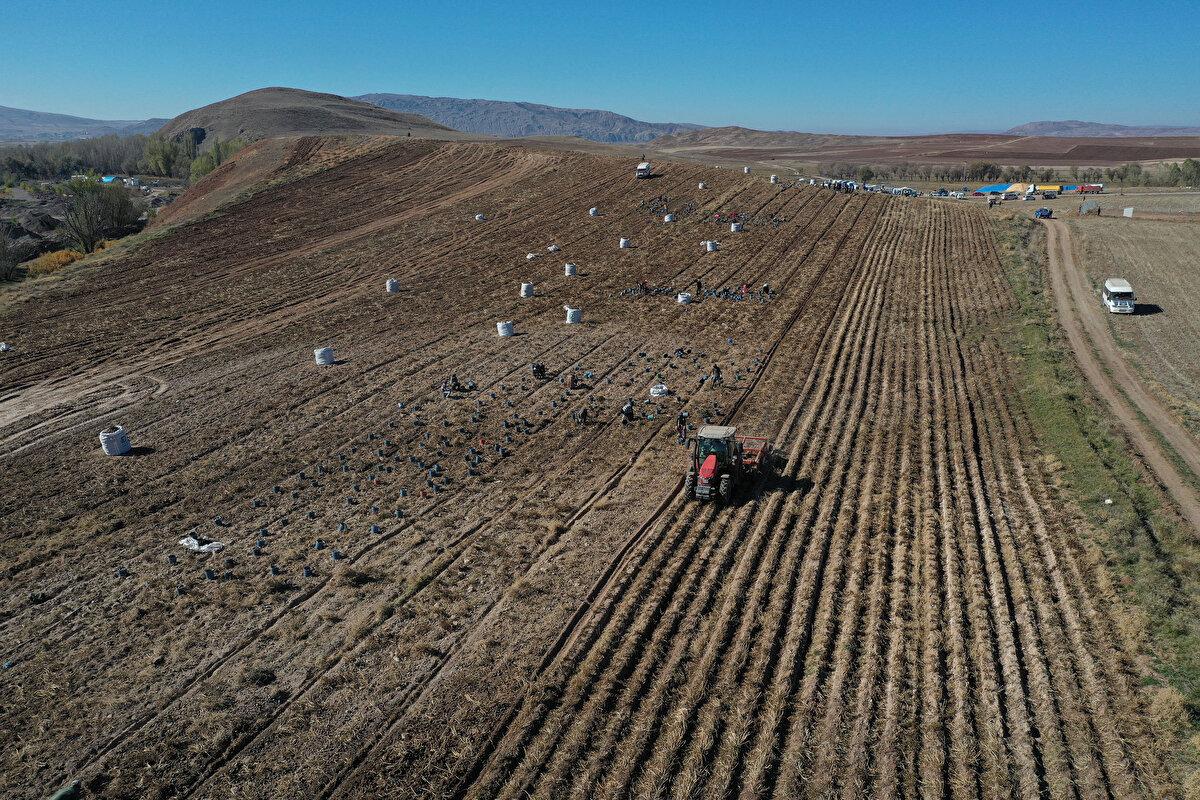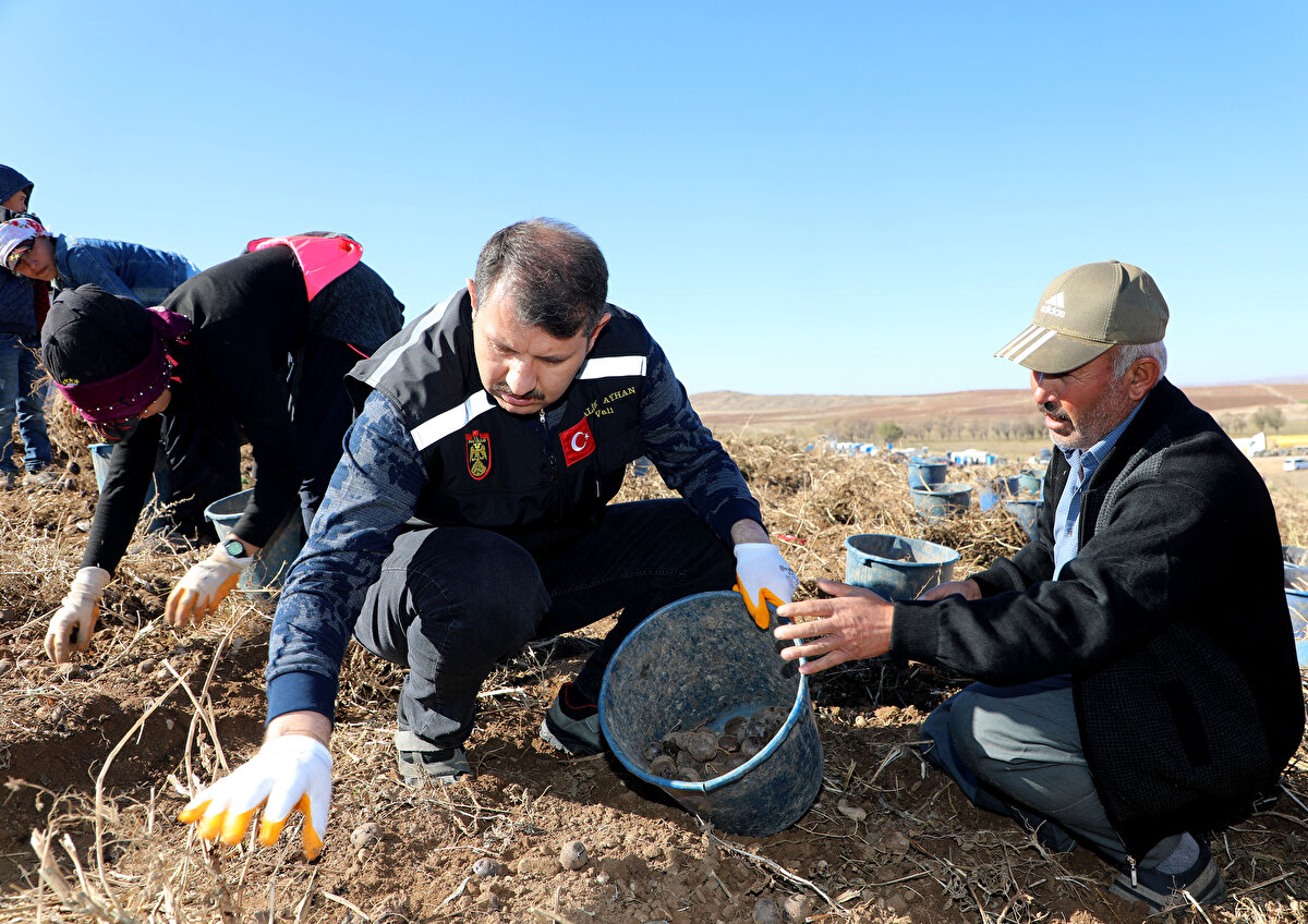 Çiftçilerle birlikte tarlada patates söken Ayhan, burada yaptığı konuşmada, Türkiye'de kullanılan tüm mor patates tohumlarının Sivas'tan temin edildiğini söyledi.