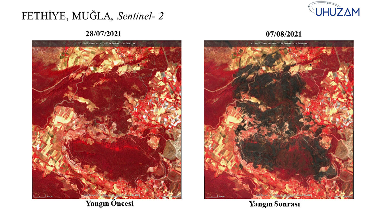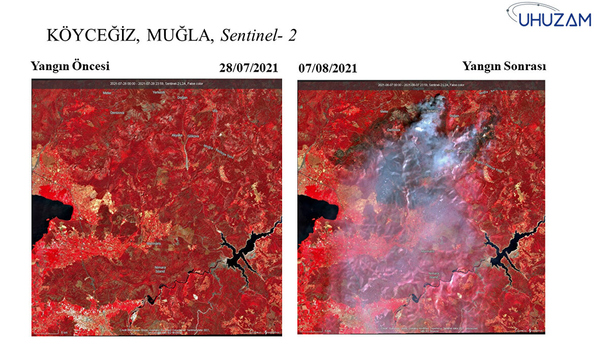 İstanbul Teknik Üniversitesi (İTÜ) Uydu Haberleşme ve Uzaktan Algılama Uygulama ve Araştırma Merkezi (UHUZAM), Akdeniz ve Ege Bölgesi'ndeki orman yangınların doğada bıraktığı tahribatı uydu aracılığıyla uzaydan görüntüledi.