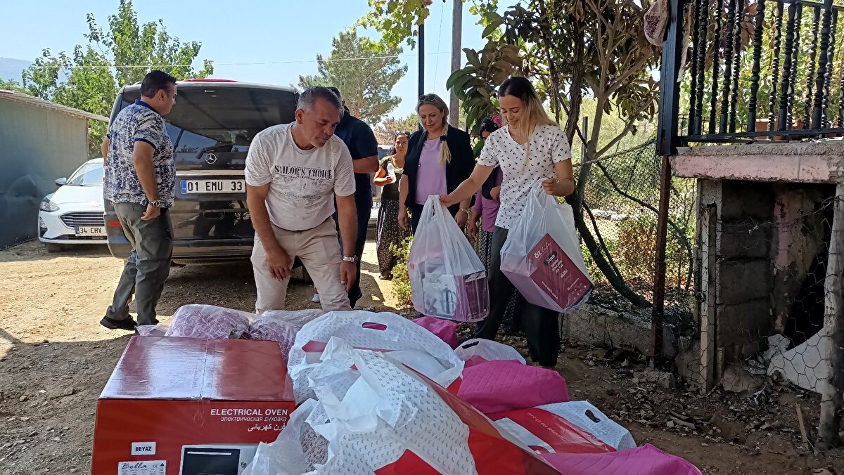 Görevimiz bittikten sonra buradaki yangın devam ediyordu. Fatma hanımın yardım çığlığını televizyonlardan gördüm. Bizde kayıtsız ve duyarsız kalmadık. Üyelerimiz ve Adanalı kadınlar olarak biz çeyizini düzmeye karar verdik. Dün buraya tespitte bulunmaya geldim. Fatma hanımla görüntülü görüştük. Çeyizlerini tek tek seçtik. Akşamdan hazırladık ve arabamıza yükledik. Böylelikle kızımızın yaralarını sarmış olduk. Şu anda buradayız çeyizi getirdik. Fatma hanıma çeyizini teslim ettik dedi.