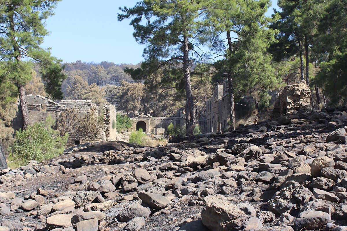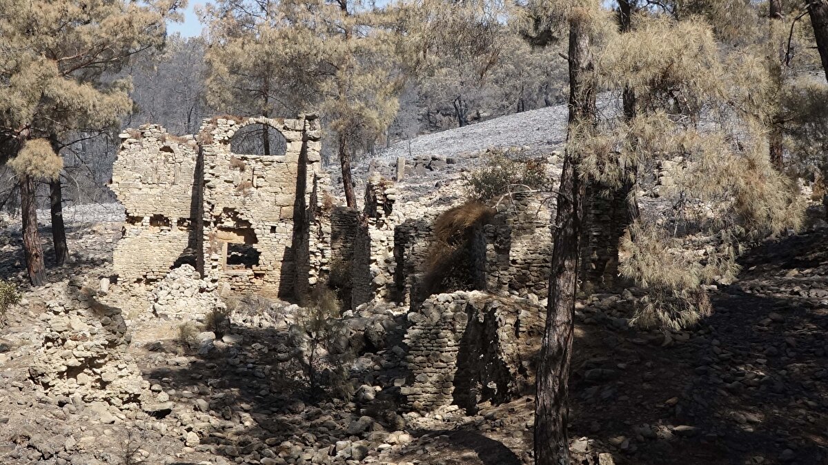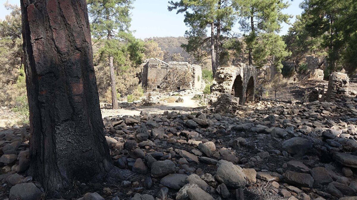 Kalıntıların bazı noktalarında yangından dolayı çökmeler meydana gelirken, ağaçlardan düşen kozalaklar ise kalıntıların içini doldurdu.