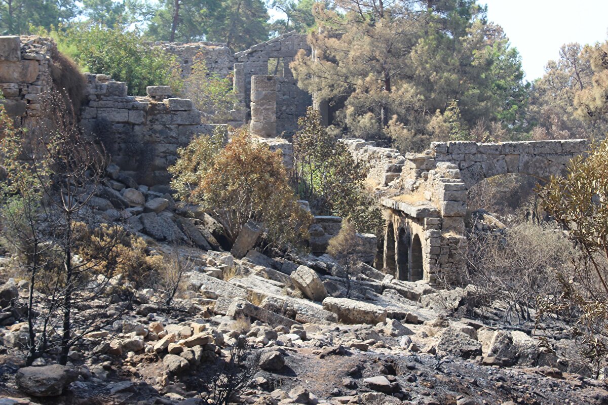 Antik kent içinde yer alan hamam, sarnıç, agora ve tapınak ise yangından dolayı simsiyah oldu.