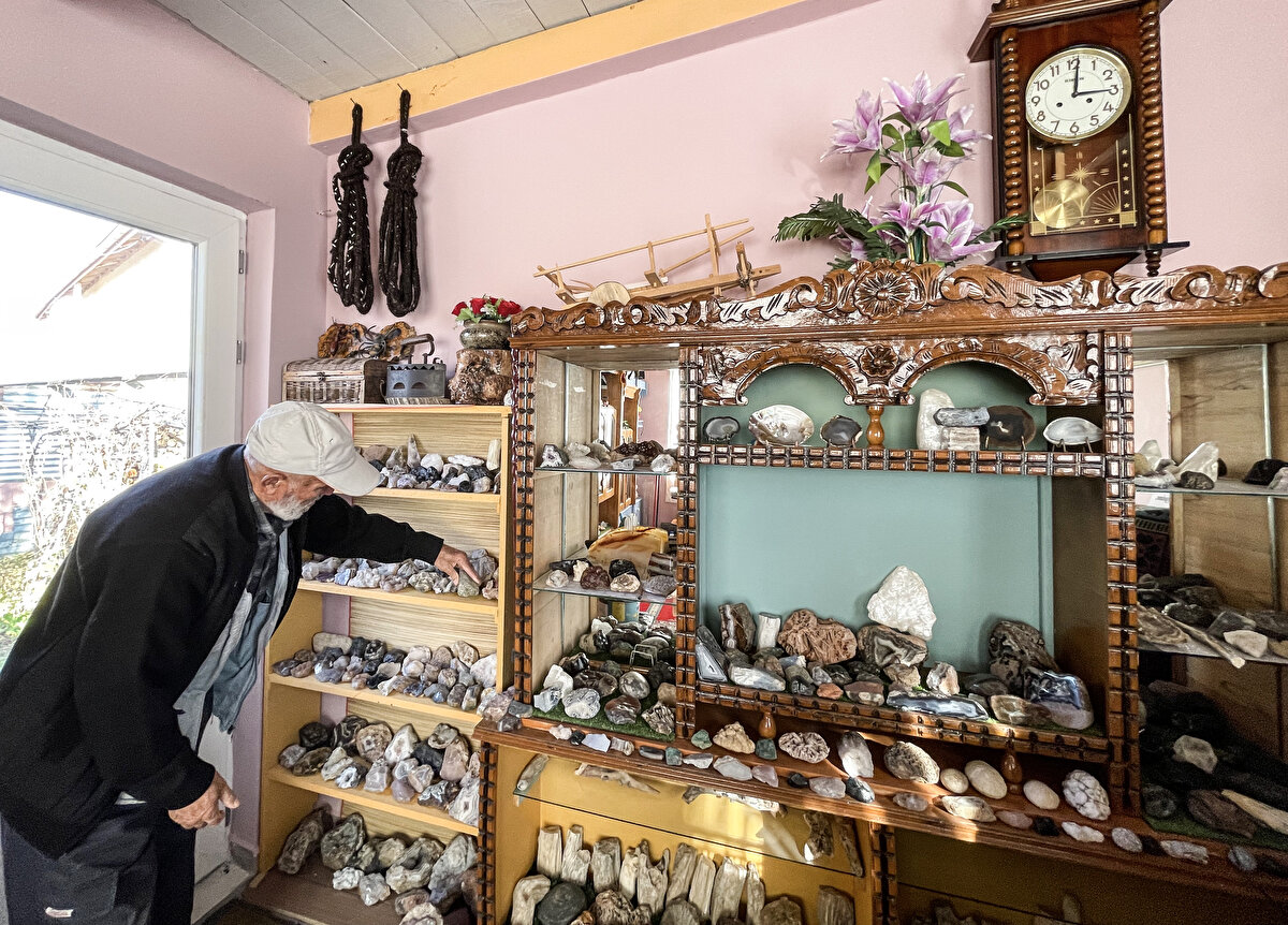 Kayserili eski inşaat ustası Mehmet Ali Özok, yıllardır topladığı 3 binden fazla taşı, eşi evde istemeyince bahçesine kurduğu odada sergiliyor.