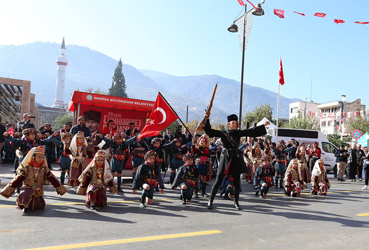 Manisa'da, 29 Ekim Cumhuriyet Bayramı törenle kutlandı. Vatandaşlar ve çocuklar, töreni ilgiyle izledi.