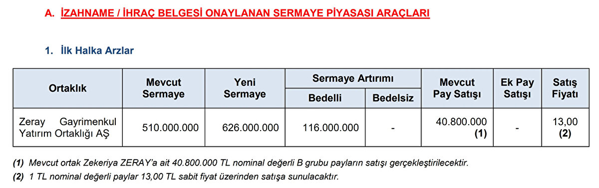 SPK bülteninde yer alan bilgilere göre; Zeray GYO'nun 1 TL nominal bedelli payları, 13,00 TL sabit fiyat üzerinden satışa sunulacak.