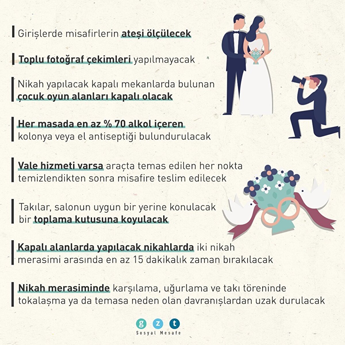 İçişleri Bakanlığı, koronavirüs tedbirleri kapsamında nikahlarda uygulanacak prosedürlere dair bir genelge yayımladı. Nikah yapılacak mekanlara maske takılarak girilecek, dans/oyun gibi amaçlarla müzik yayını yapılmayacak, takılar kutuya atılacak.