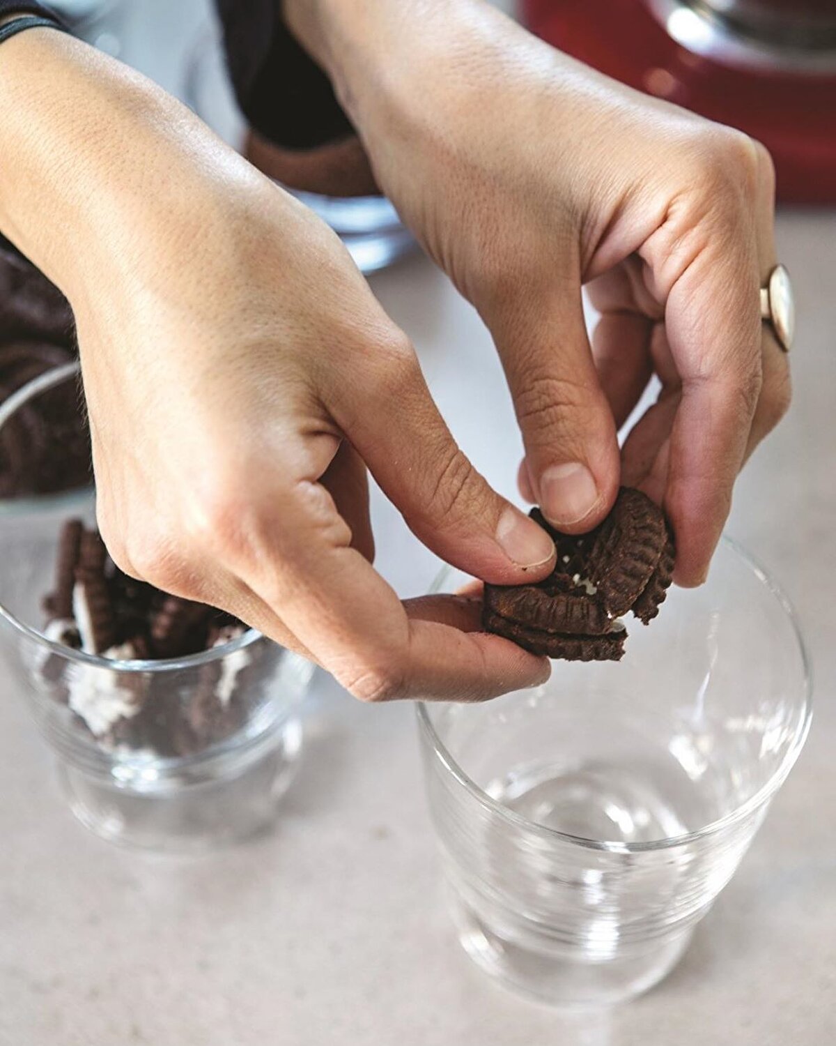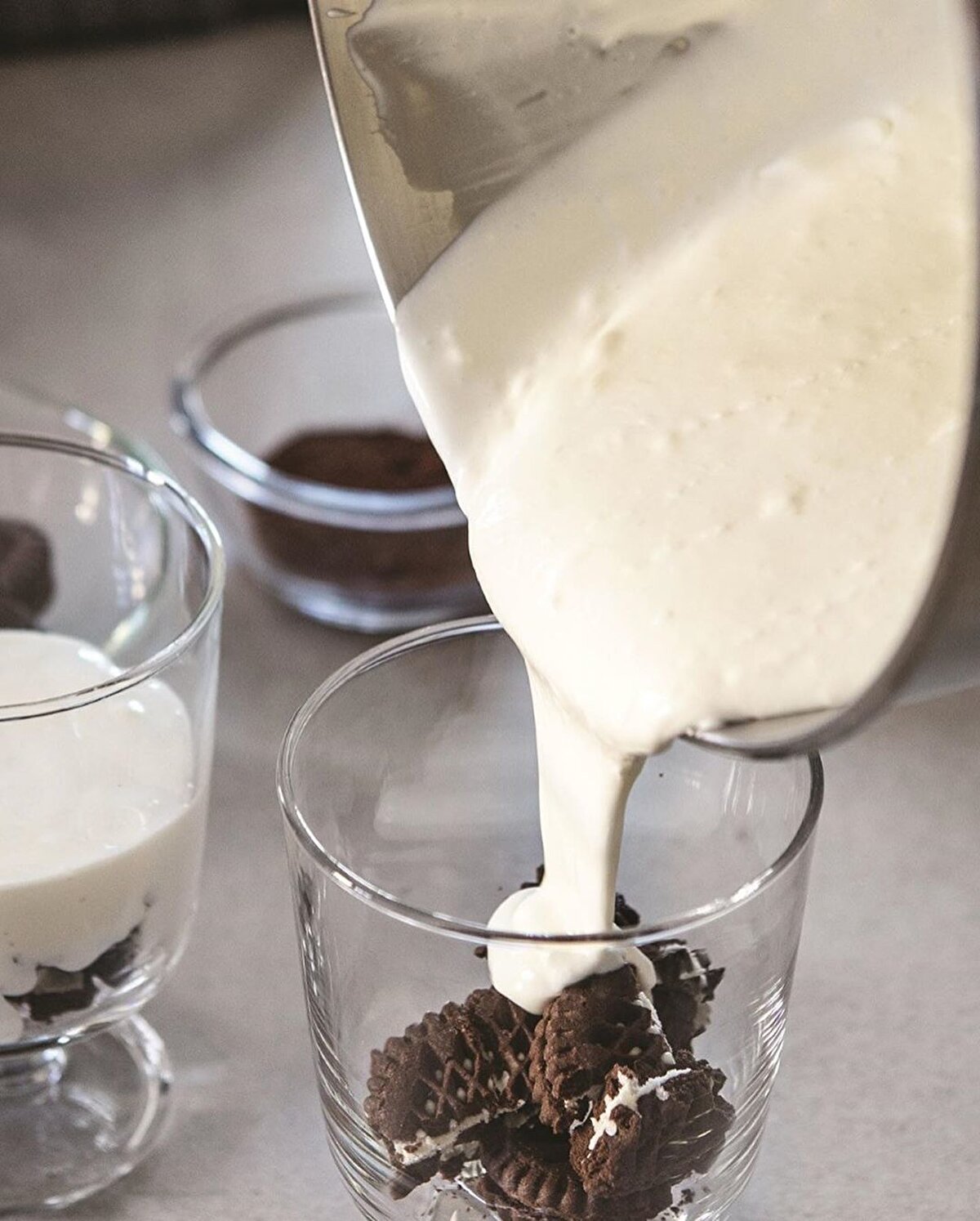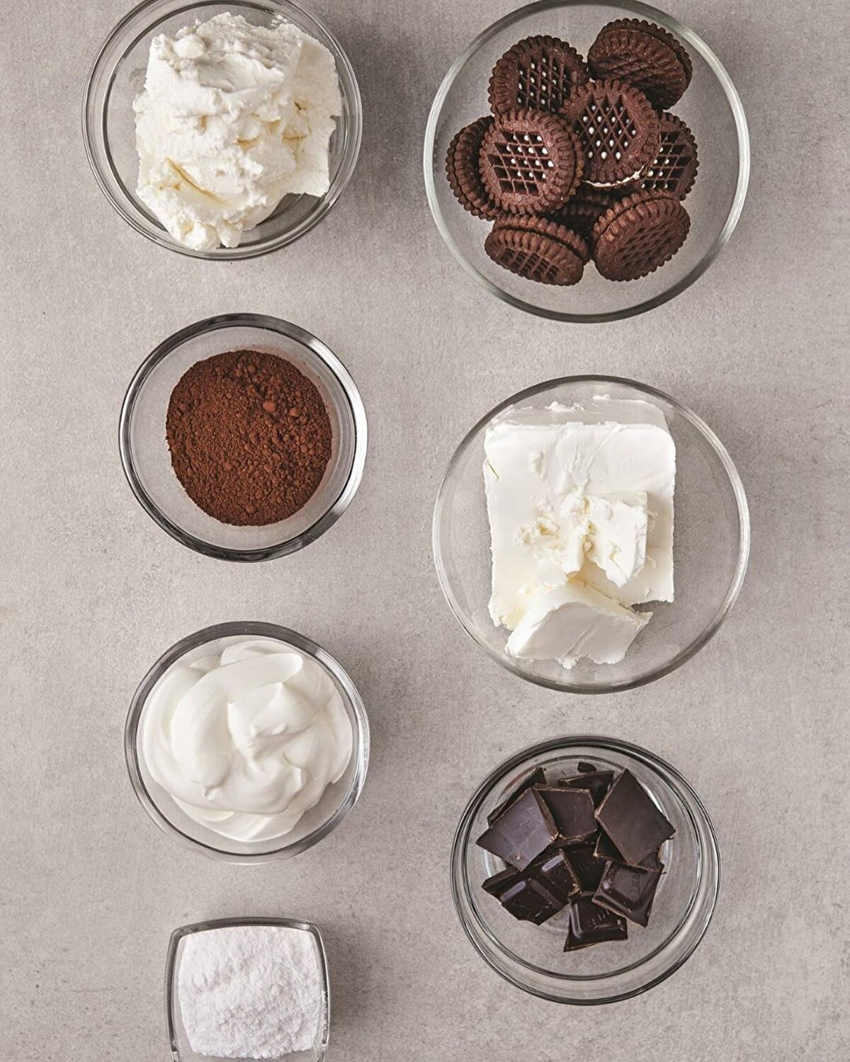 Yapılışı: Krem peyniri mikserin haznesine alın. Labneyi de ekleyin. Pudra sekerini de ekleyin ve krem kıvamına gelene kadar çırpın. Yoğurdu ekleyin ve çırpmaya devam edin. Çikolatayı benmaride eritin. Servis kuplarının zeminine bisküvilerden kırın ve paylastırın. Yoğurtlu harcın yarısını bisküvilerin üzerine paylaştırın. Erimiş çikolatayı kalan labneli karışıma yedirin. Beyaz kısmın üzerine paylaştırın. Üzerlerine ekstradan toz kakao serpin ve bisküvi kırıkları paylaştırın. Buzdolabında soğuttuktan sonra servis edin.
