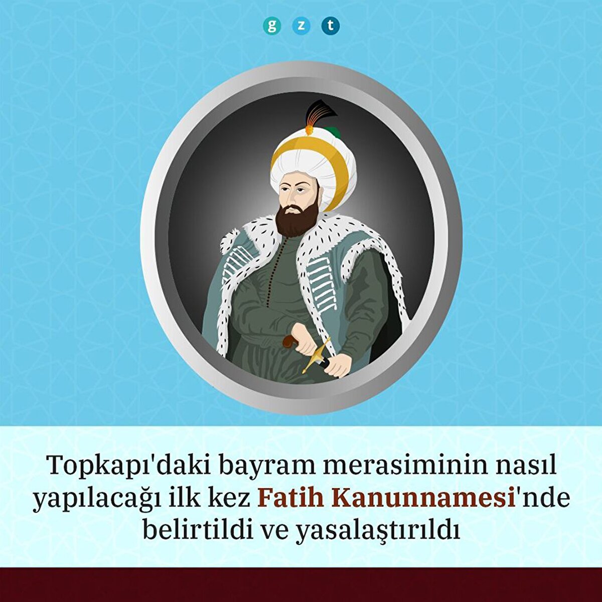 Yüzyıllar önce bayram merasimlerinin en büyüğü Topkapı'da gerçekleşirdi. Törenin nasıl yapılacağı ilk kez Kanunname-i Al-i Osman'da Fatih Sultan Mehmet tarafından belirlendi