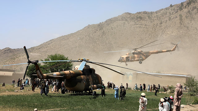 Giyan ilçe merkezine, gün boyu, deprem nedeniyle çeşitli ülkelerden Afganistan'a gönderilen insani yardımları taşıyan helikopterler indi.