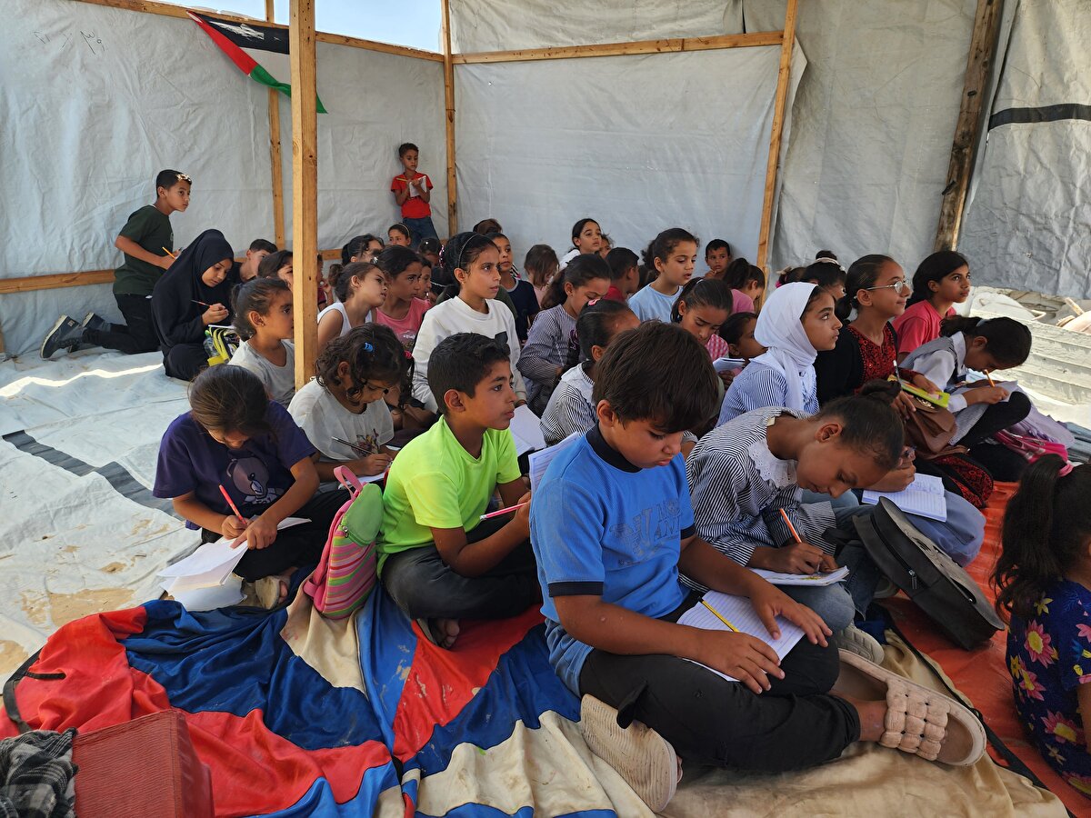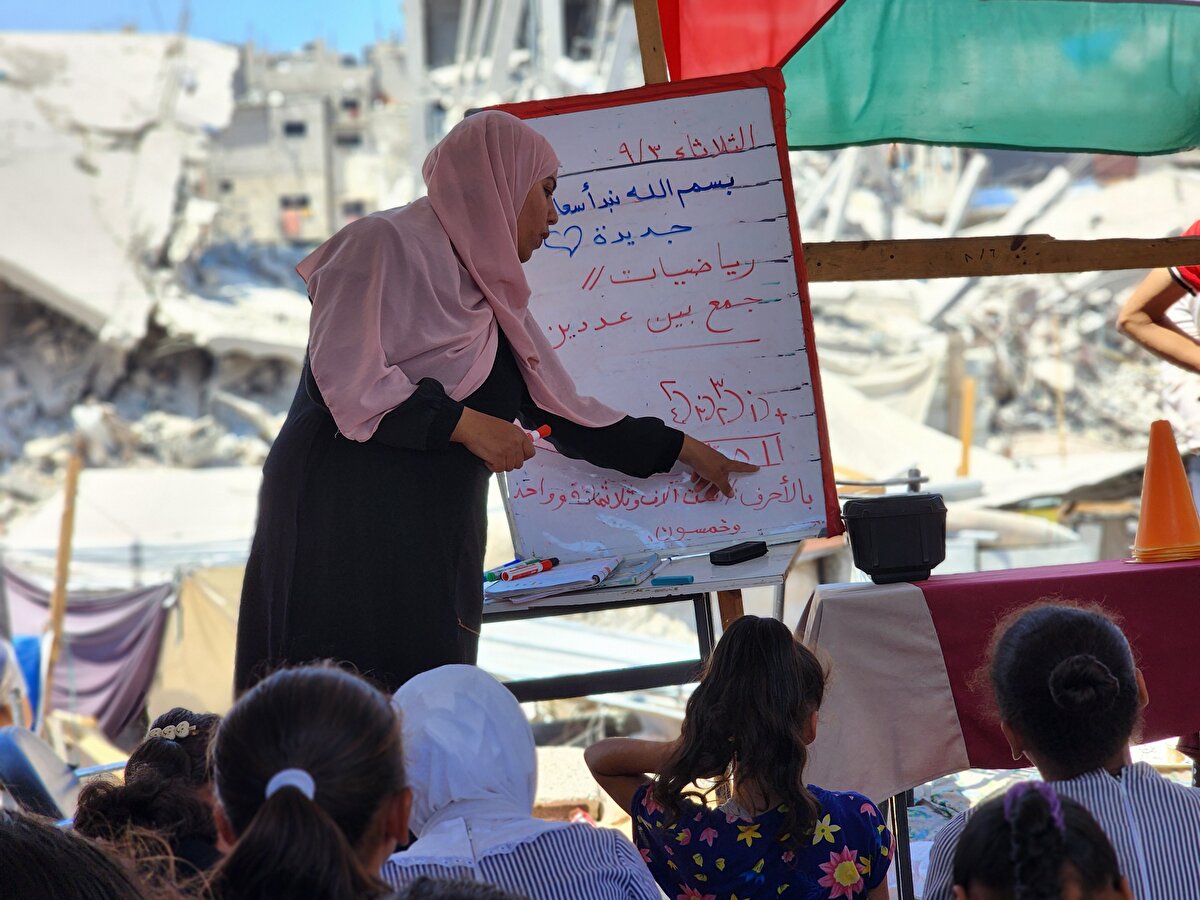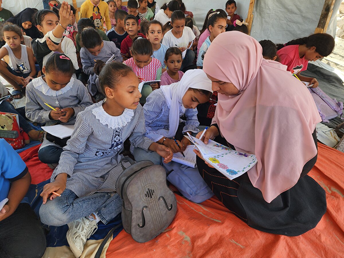 Ölü sayısının 40 bini geçtiği, bulaşıcı hastalıkların yayıldığı, evlerin-hastanelerin-yolların bir bir bombalandığı, en temel yiyecek-içeceklerden dahi ulaşılamaz hale geldiği Gazze'de, İsrail ordusunun Han Yunus kentine düzenlediği saldırılarda evi yıkılan öğretmen Alaa Abu Mustafa, yıkılan evinin enkazı üzerine kurduğu çadır okulda öğrencilere ders vermeye devam ediyor. Öğretmen Alaa, hâlihazırdaki tüm kısıtlı ve zor şartlara rağmen ilkokul öğrencilerinin eğitimden mahrum kalmaması için çaba sarf ediyor.
