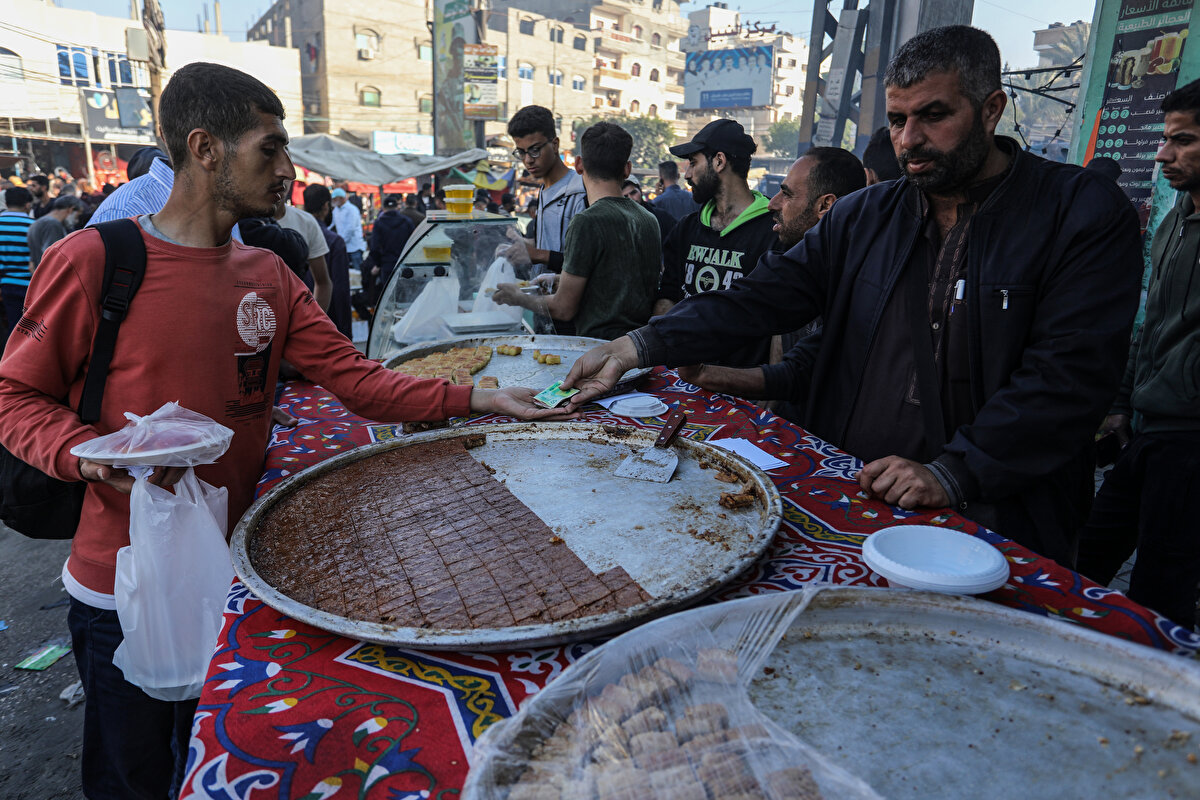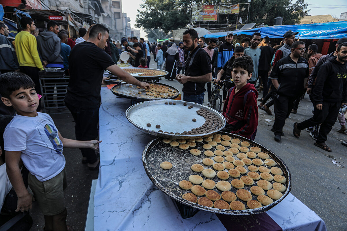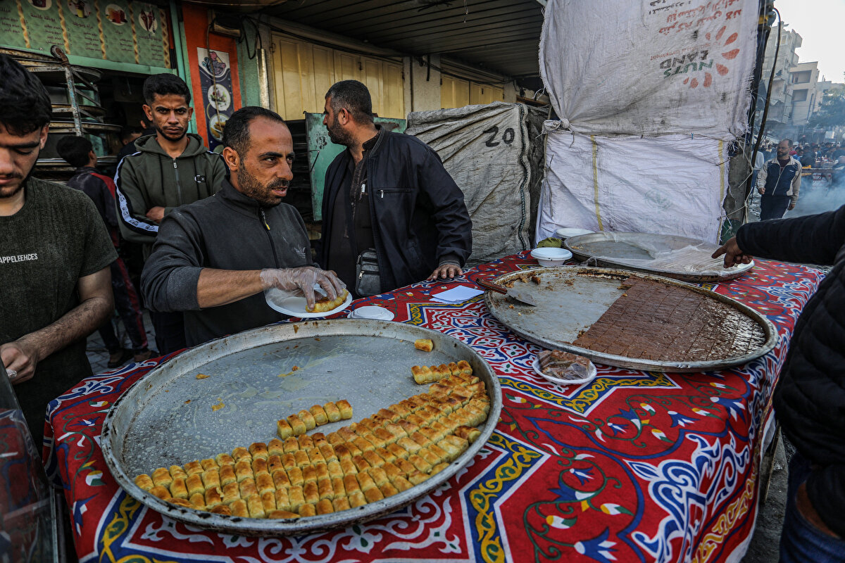 Saldırılar nedeniyle binlerce kişinin göç ettiği Refah'ta bayram hareketliliği yaşanıyor. Filistinliler, kentte kurulan çarşıya gelerek burada en fazla bayrama özgü tatlı ve kurabiyelerine rağbet gösteriyor.