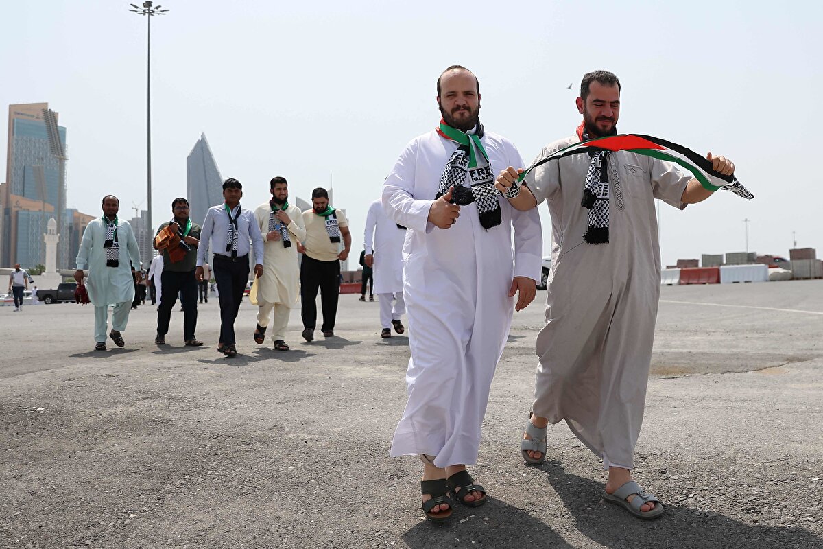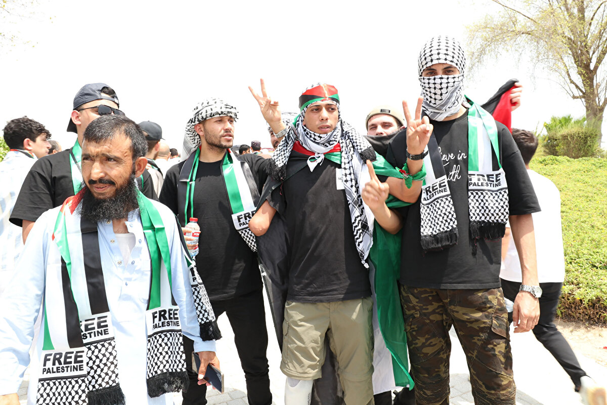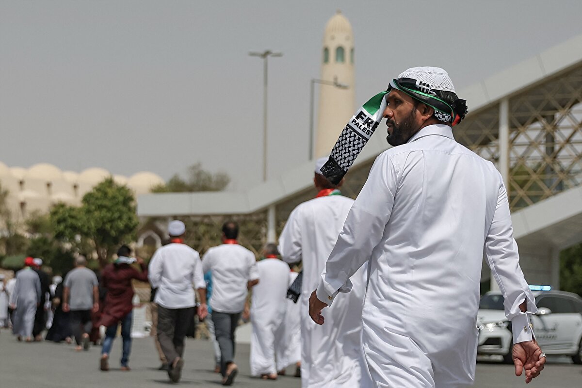 Camiye gelen binlerce Müslüman, Filistin bayraklarıyla törene katılırken, Filistin bayrağının renkleri olan siyah, beyaz, yeşil ve kırmızı erkek, kadın ve çocuklardan oluşan büyük kalabalığın üzerinde noktalar halinde duruyordu.