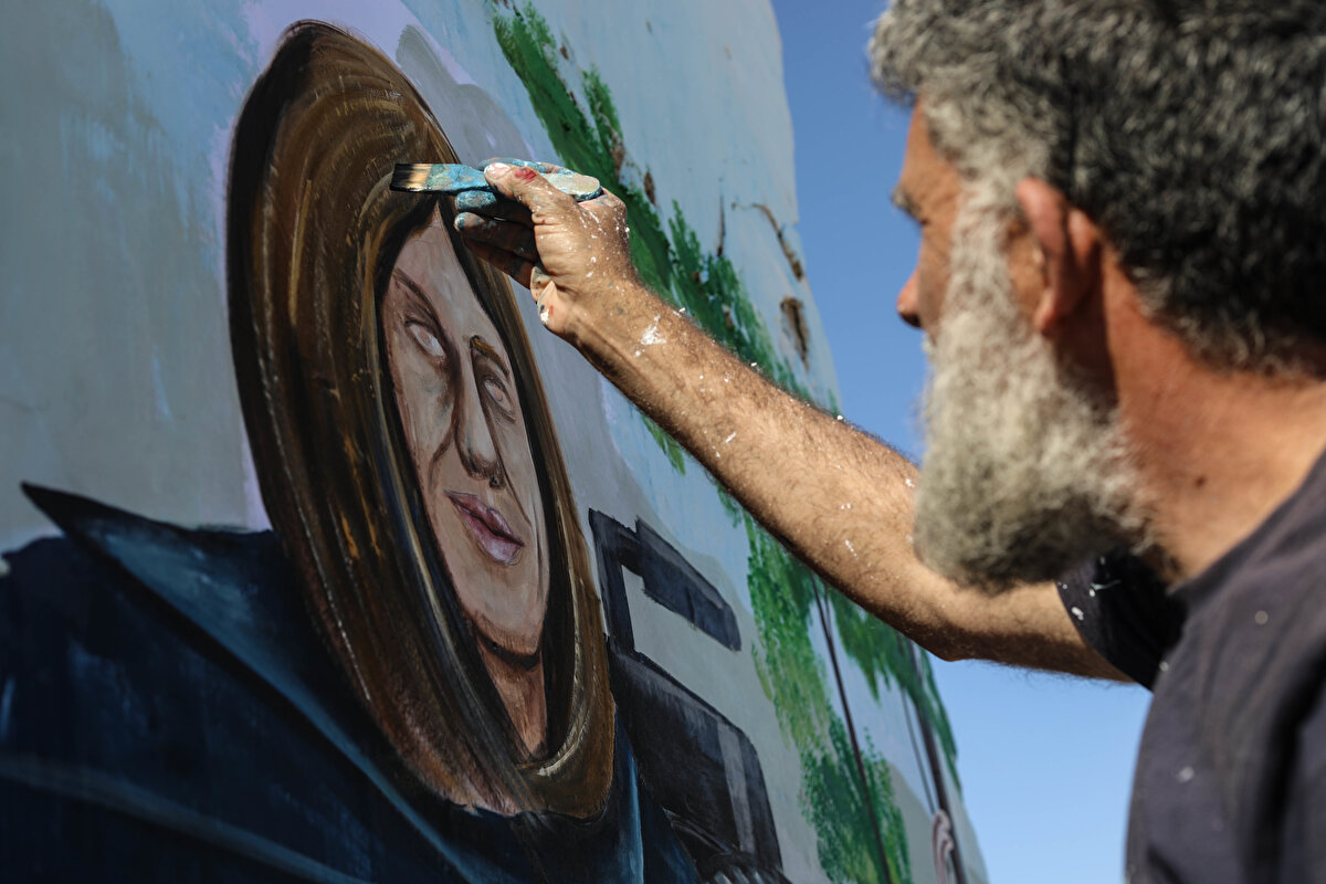 Sanatçı Esmer, yıkıntılar içindeki bir duvara bu kez de işgal altındaki Batı Şeria'nın Cenin Mülteci Kampı'nda İsrail askerleri tarafından açılan ateş sonucu hayatını kaybeden gazeteci Şirin Ebu Akile'nin resmini yaptı.