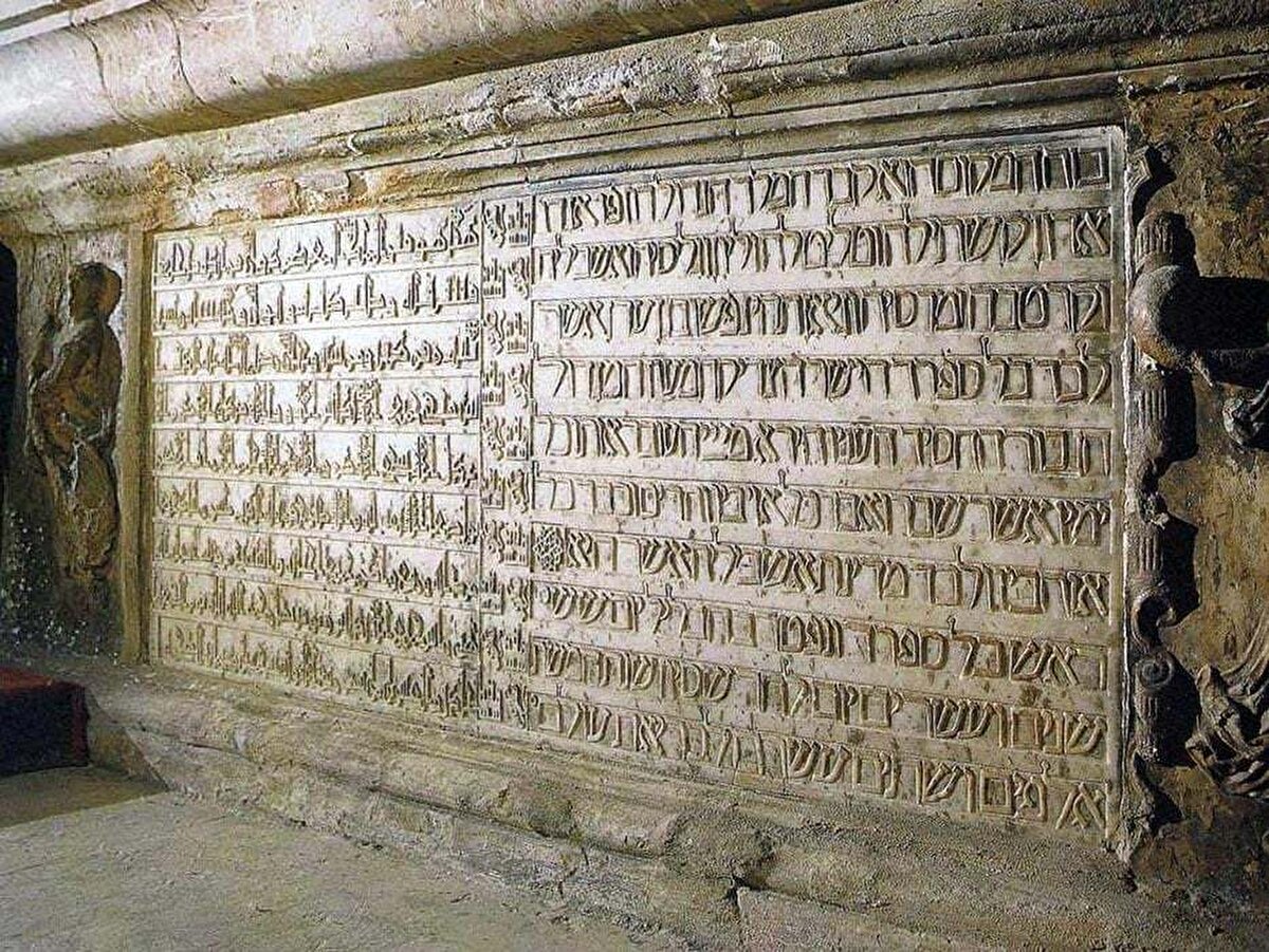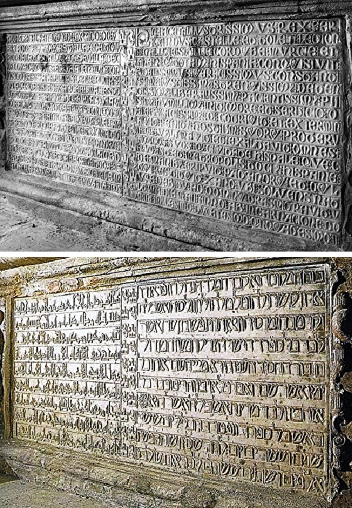 Kastilya-Leon Kralı III. Fernando'nun (1201-1252) İşbiliyye Ulu Camii içindeki kabri. Cami, 1248'de Hristiyanların şehri ele geçirmesinden sonra Sevilla Katedrali'ne çevrilmiş, minaresi de çan kulesine dönüştürülmüştür. III. Fernando'nun kabrinin kaidesinde bulunan kitabeyi, oğlu Kral X. Alfonso dört dilde yazdırmıştır: Arapça, İbranice (altta), Latince ve Kastilce (yukarıda).