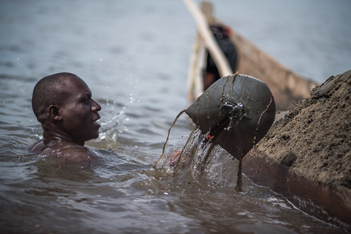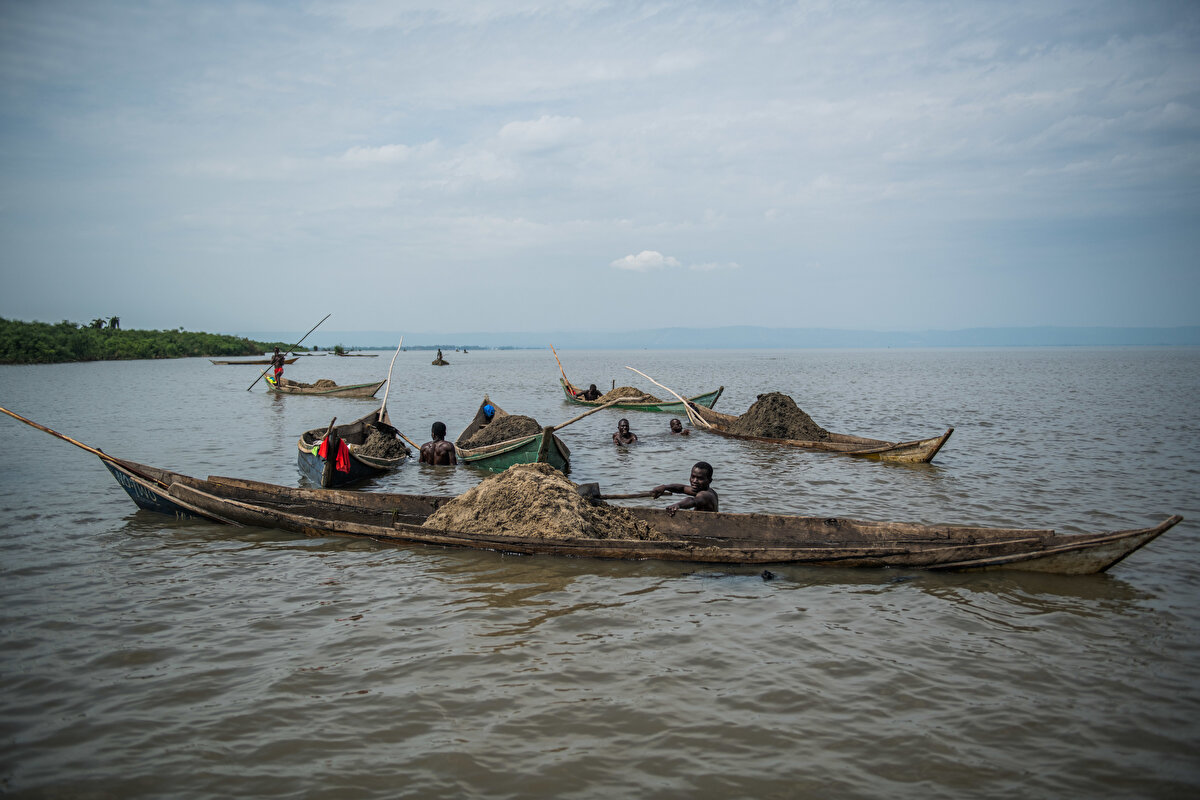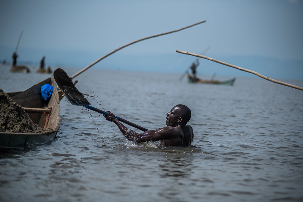 Kenya'nın Kisumu kentine bağlı Nyamware köyündeki Kenyalılar, Victoria Gölü'nün dibinden kum çıkararak geçimlerini sağlıyor.