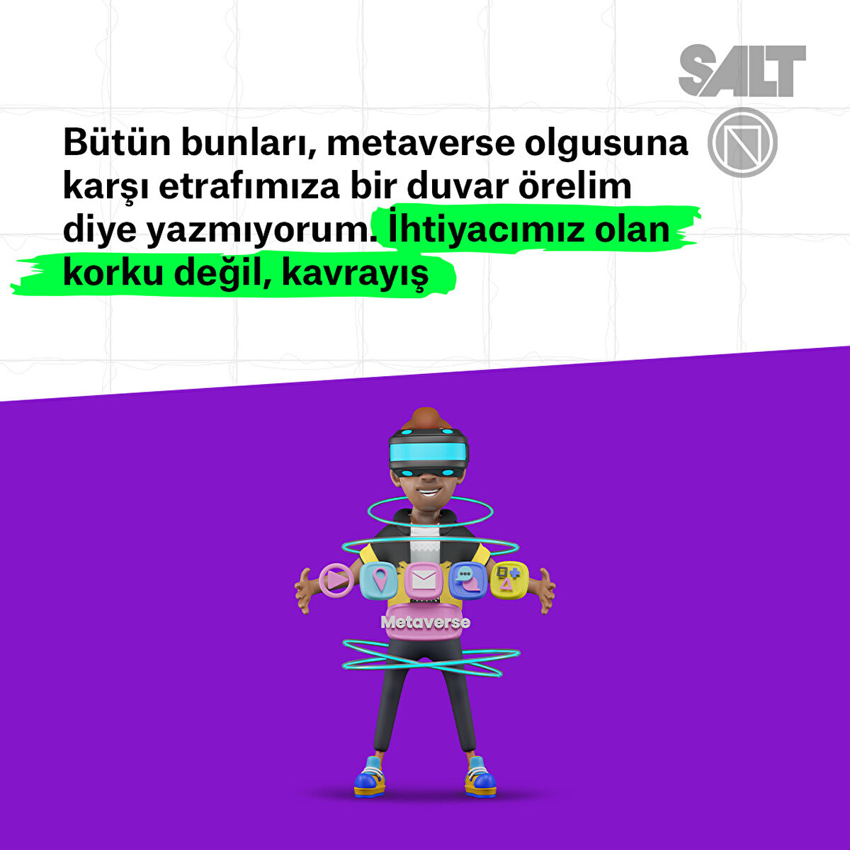 Metaverse olgusuna karşı ne yapmalıyız? İhtiyacımız olan korku değil, kavrayış. İlk zamanlar kimi âlimlerimiz halkı fotoğraf makinesine karşı korkutacak konuşmalar yaptılar. Oysa bizi akışa kapılmaktan kurtaracak olan çare, kameranın değerlerimizin yozlaşmasına izin verilmeyecek şekilde kullanımıydı