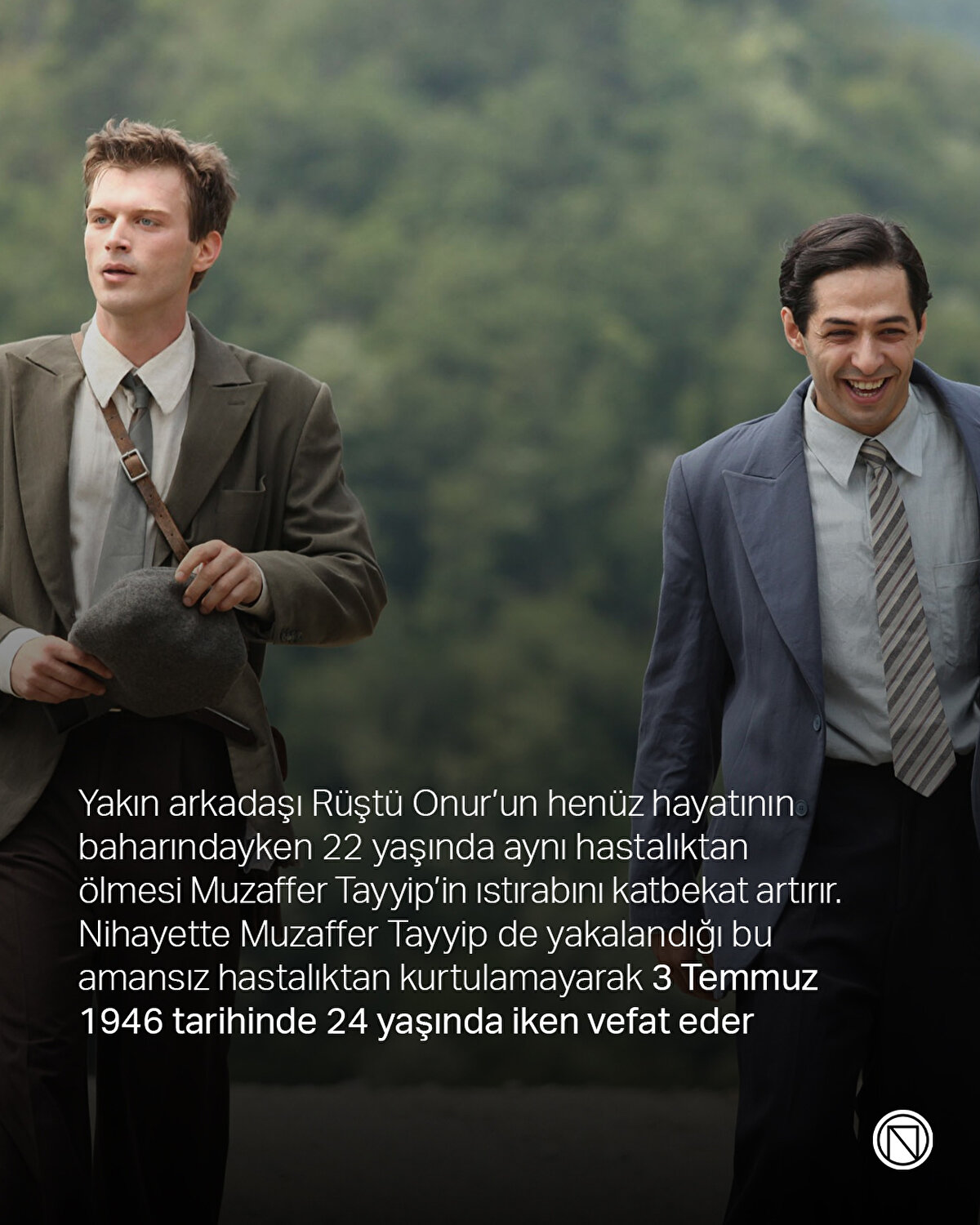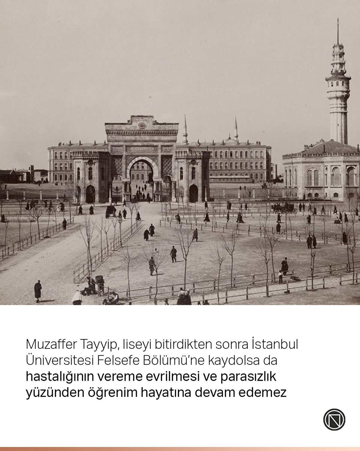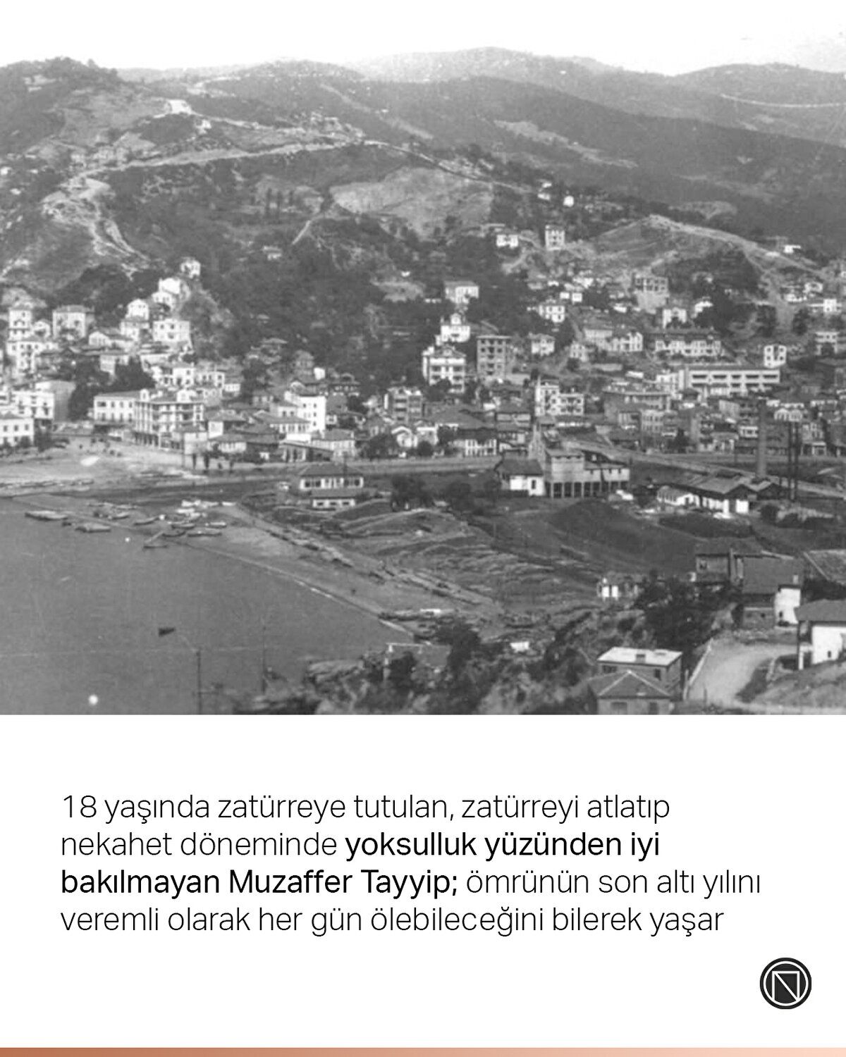 Muzaffer Tayyip, liseyi bitirdikten sonra İstanbul Üniversitesi Felsefe Bölümü'ne kaydolsa da hastalığının vereme evrilmesi ve parasızlık yüzünden öğrenim hayatına devam edemez. Kısa bir süre sonra Zonguldak'a dönerek Ereğli Kömür İşletmeleri'nde memur olarak çalışmaya başlar. 18 yaşında zatürreye tutulan, zatürreyi atlatıp nekahet döneminde yoksulluk yüzünden iyi bakılmayan Muzaffer Tayyip; ömrünün son altı yılını veremli olarak her gün ölebileceğini bilerek yaşar. Yakın arkadaşı Rüştü Onur'un henüz hayatının baharındayken 22 yaşında aynı hastalıktan ölmesi Muzaffer Tayyip'in ıstırabını katbekat artırır. Nihayette Muzaffer Tayyip de yakalandığı bu amansız hastalıktan kurtulamayarak 3 Temmuz 1946 tarihinde 24 yaşında iken vefat eder.