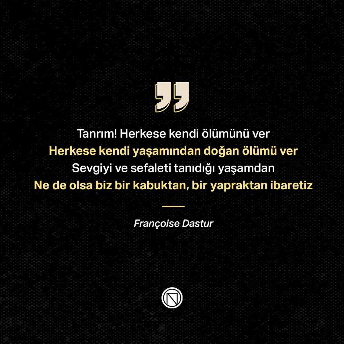 Tanrım! Herkese kendi ölümünü ver Herkese kendi yaşamından doğan ölümü ver Sevgiyi ve sefaleti tanıdığı yaşamdan Ne de olsa biz bir kabuktan, bir yapraktan ibaretiz